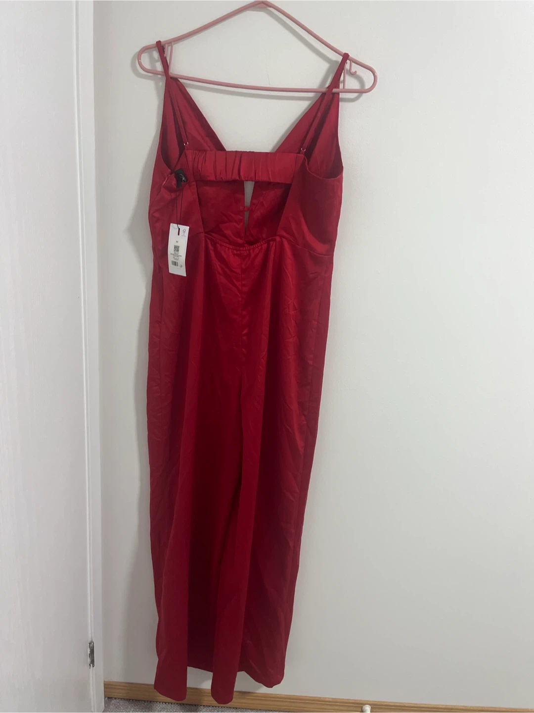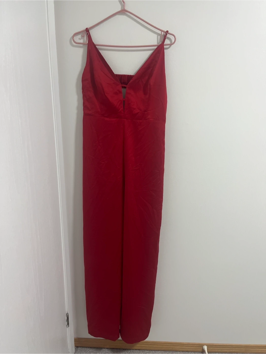 This wide leg satin jumpsuit from Dynamite is a stunning red colour. It features spaghetti straps and a cutout detail at the back. Satin material.brand new pick up cash only
