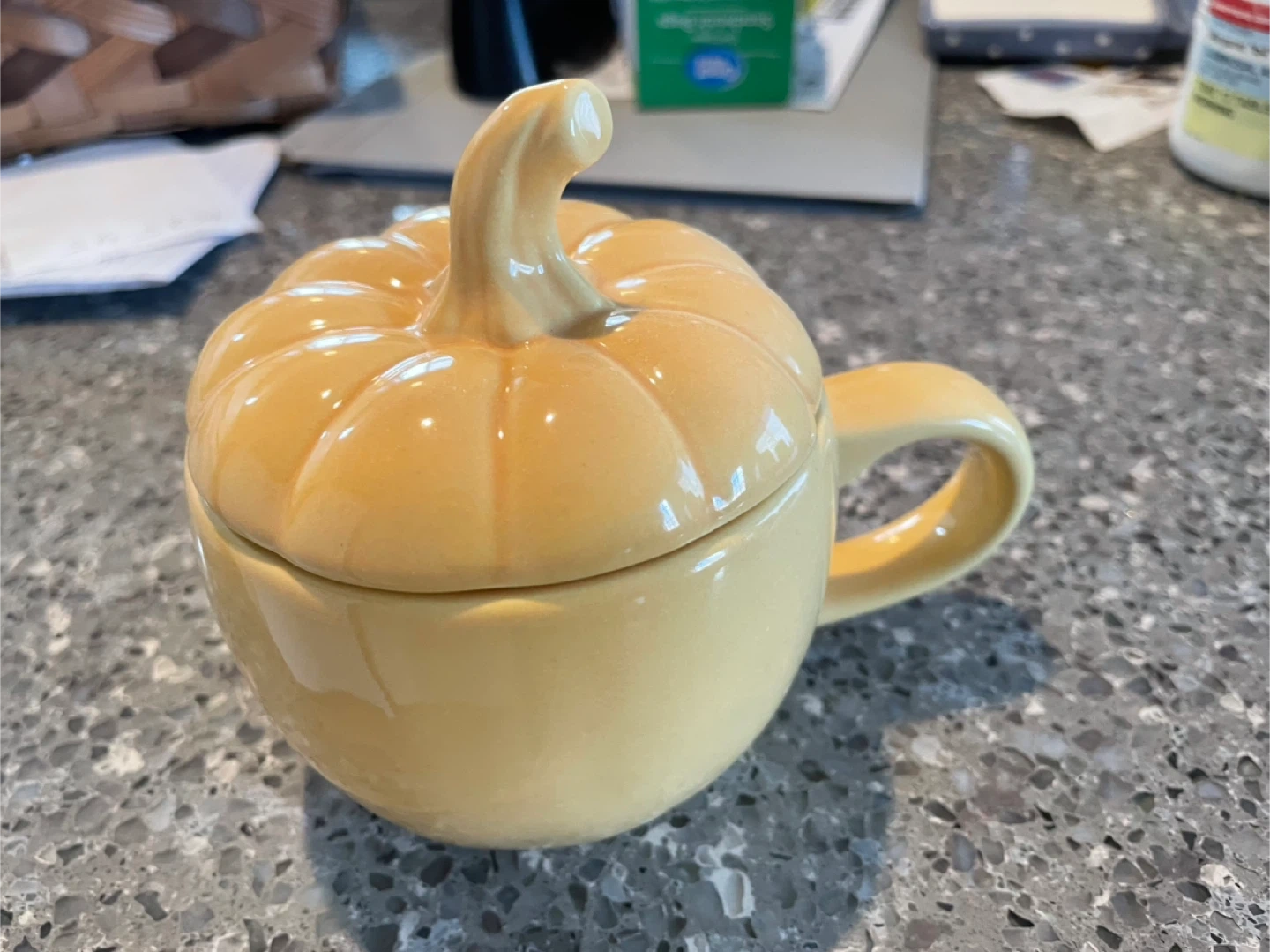 Cute ceramic mug shaped like a pumpkin. It comes with a matching lid and has a handy handle. Perfect for enjoying your favourite warm beverages during the fall season!