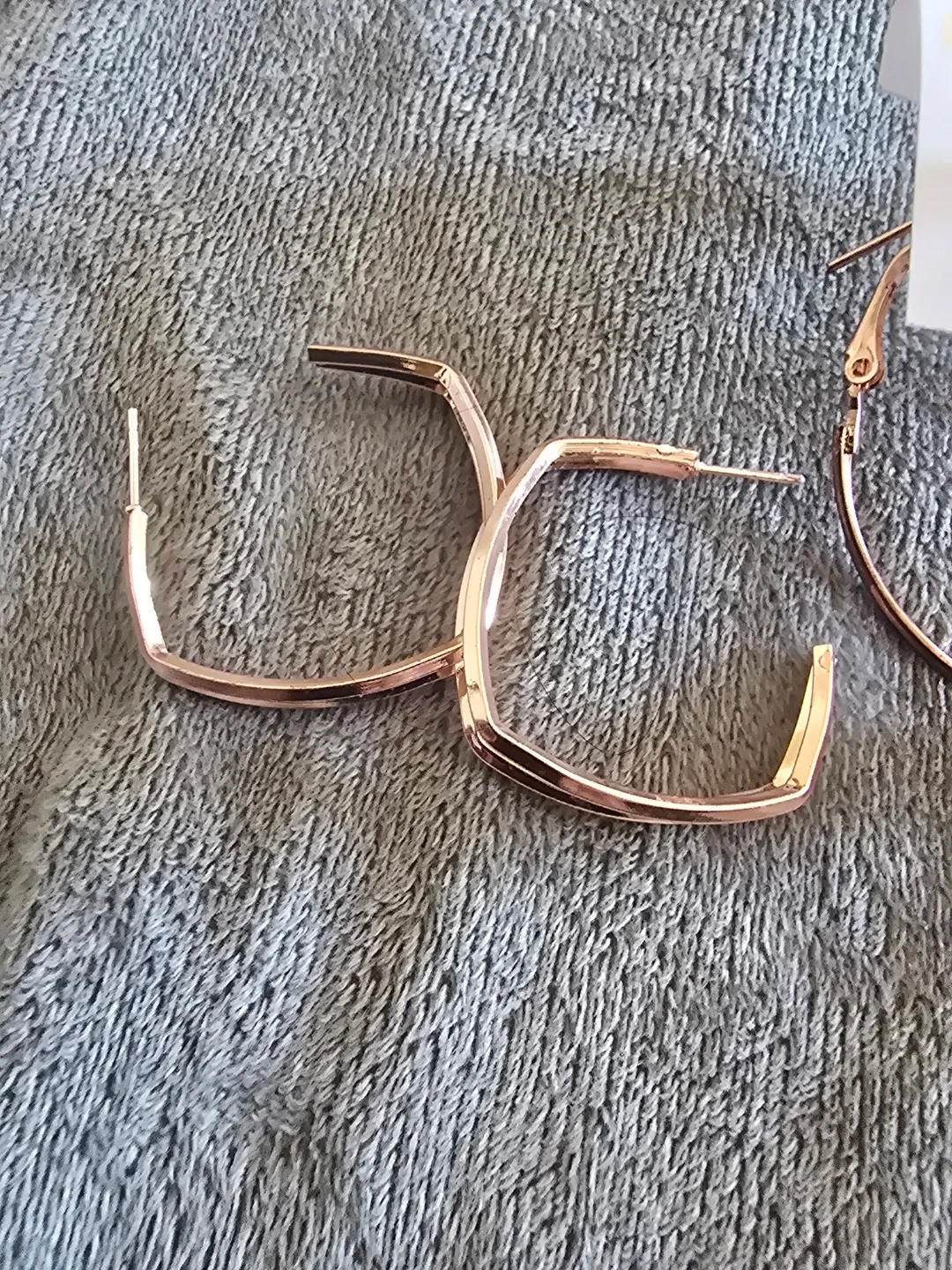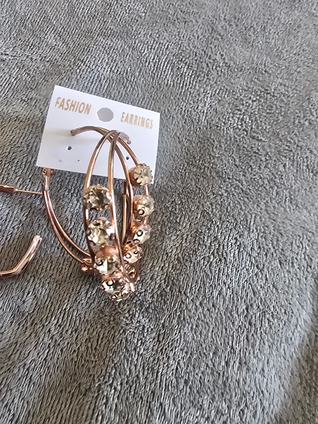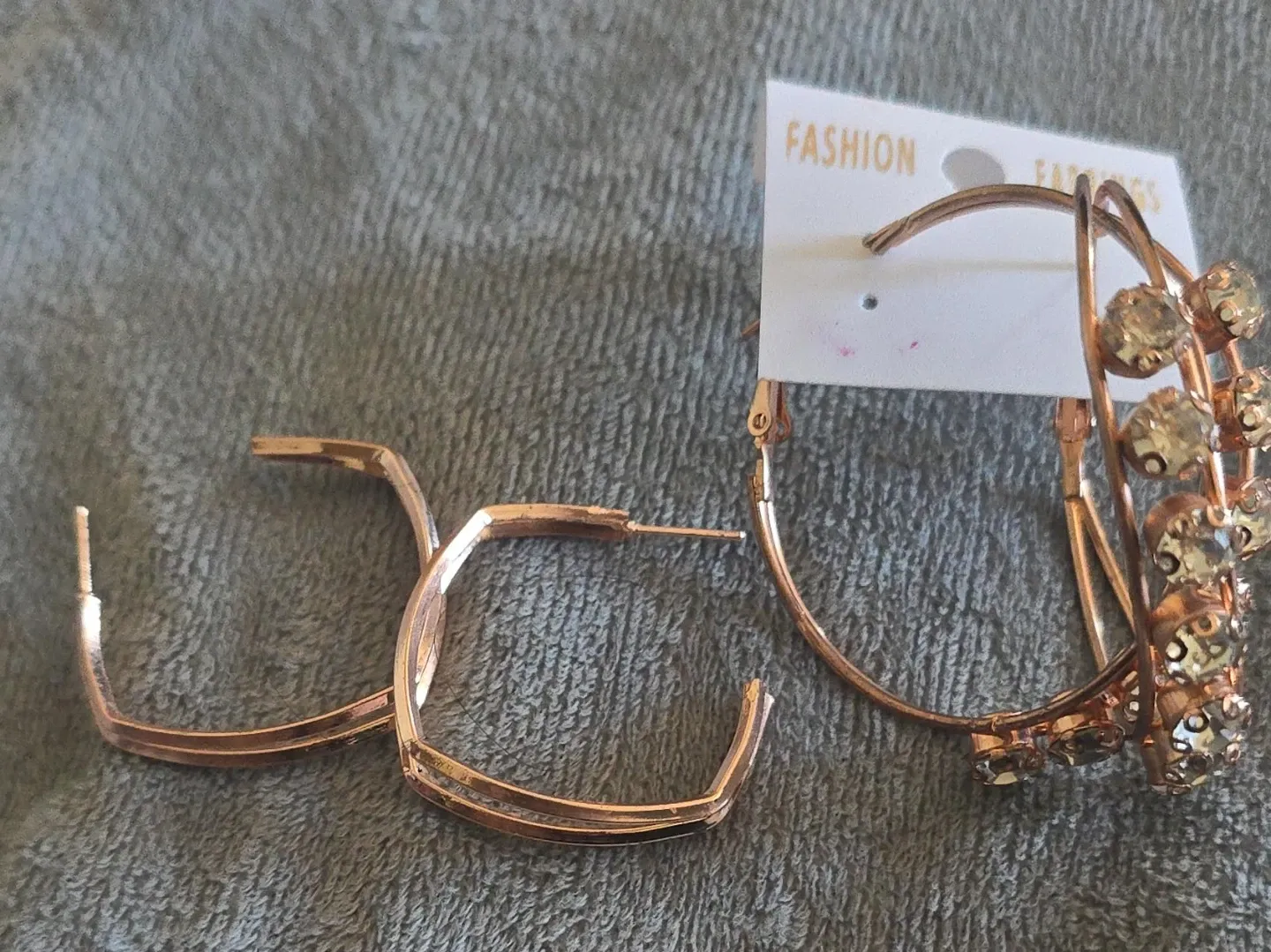 Two pairs of rose gold coloured hoop earrings are included. One pair is a geometric design, and the other is adorned with clear rhinestones. These would be great for adding a touch of sparkle to any outfit!