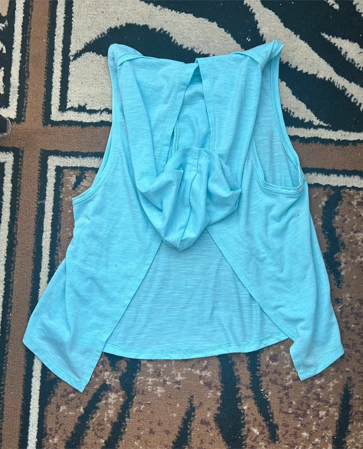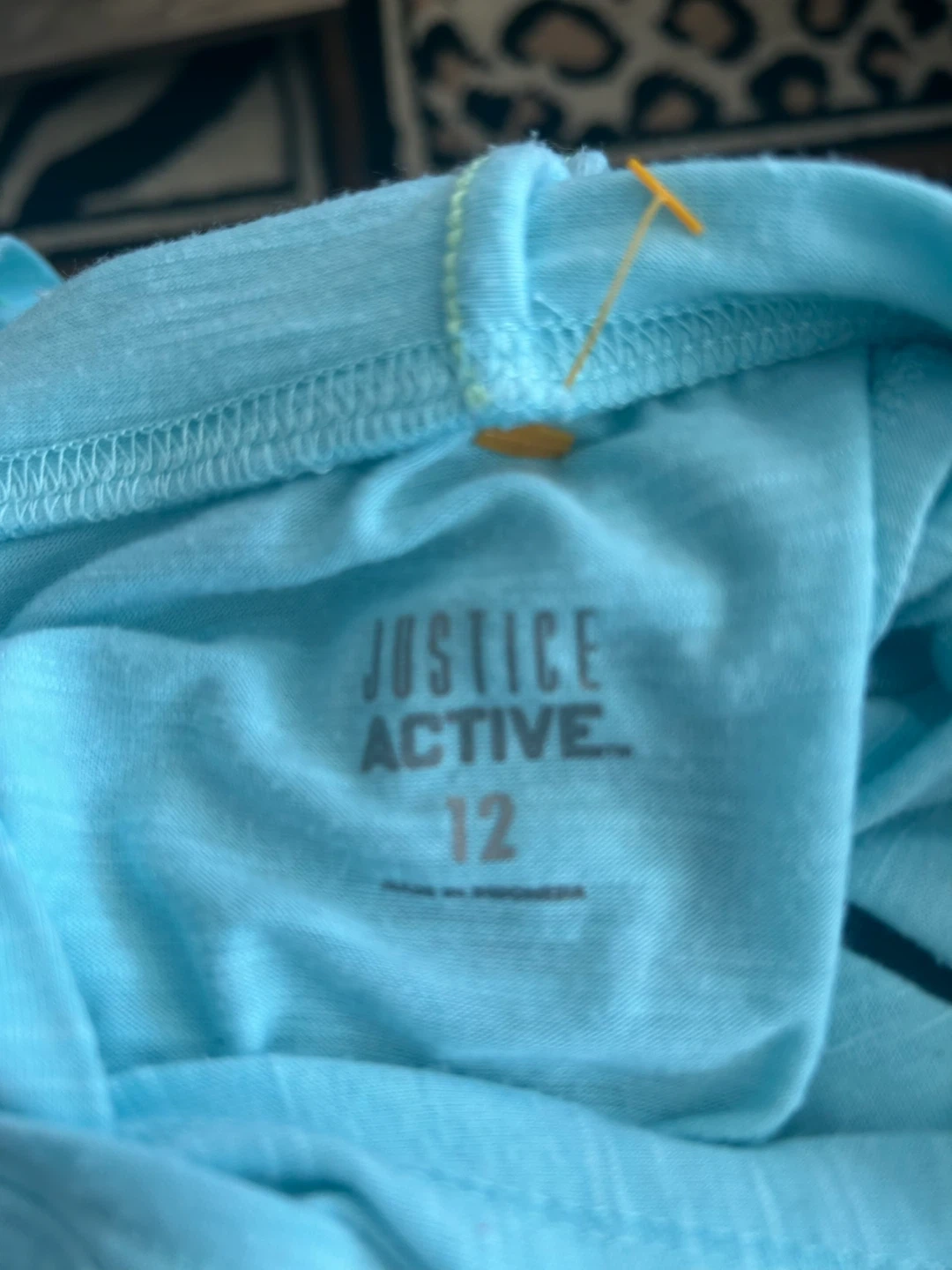 This is a light blue sleeveless tank top from Justice Active. It features a heart graphic with 'Gymnast' inside. The back has a hooded detail with a split design. Size is 12.