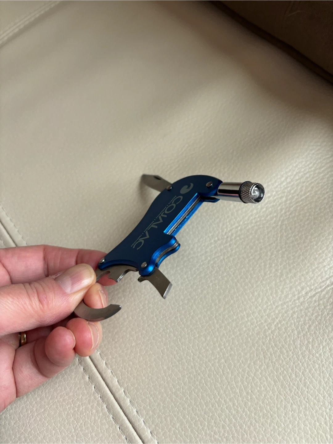This branded multi-tool is a handy keychain accessory. It includes a small knife, bottle opener, and a built-in light (doesn’t work, maybe needs new batteries). Can be used as a keychain as well. Compact and blue, it's useful for everyday tasks. It's a great addition for anyone needing a quick tool on the go!