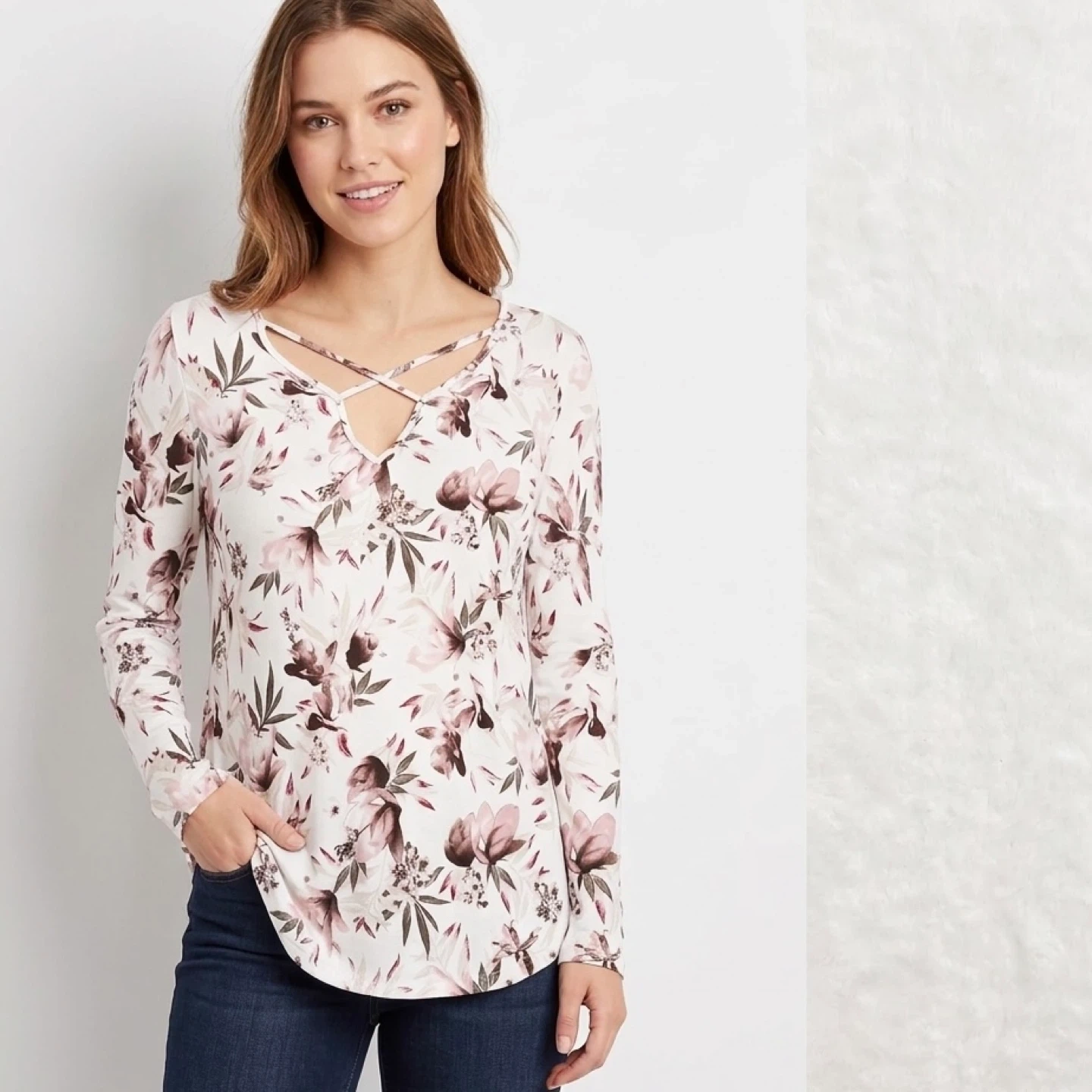 lily morgan, floral, long sleeve, relaxed fit, criss cross, v neck, white, pink, flower, casual, top, shirt, blouse, oversized