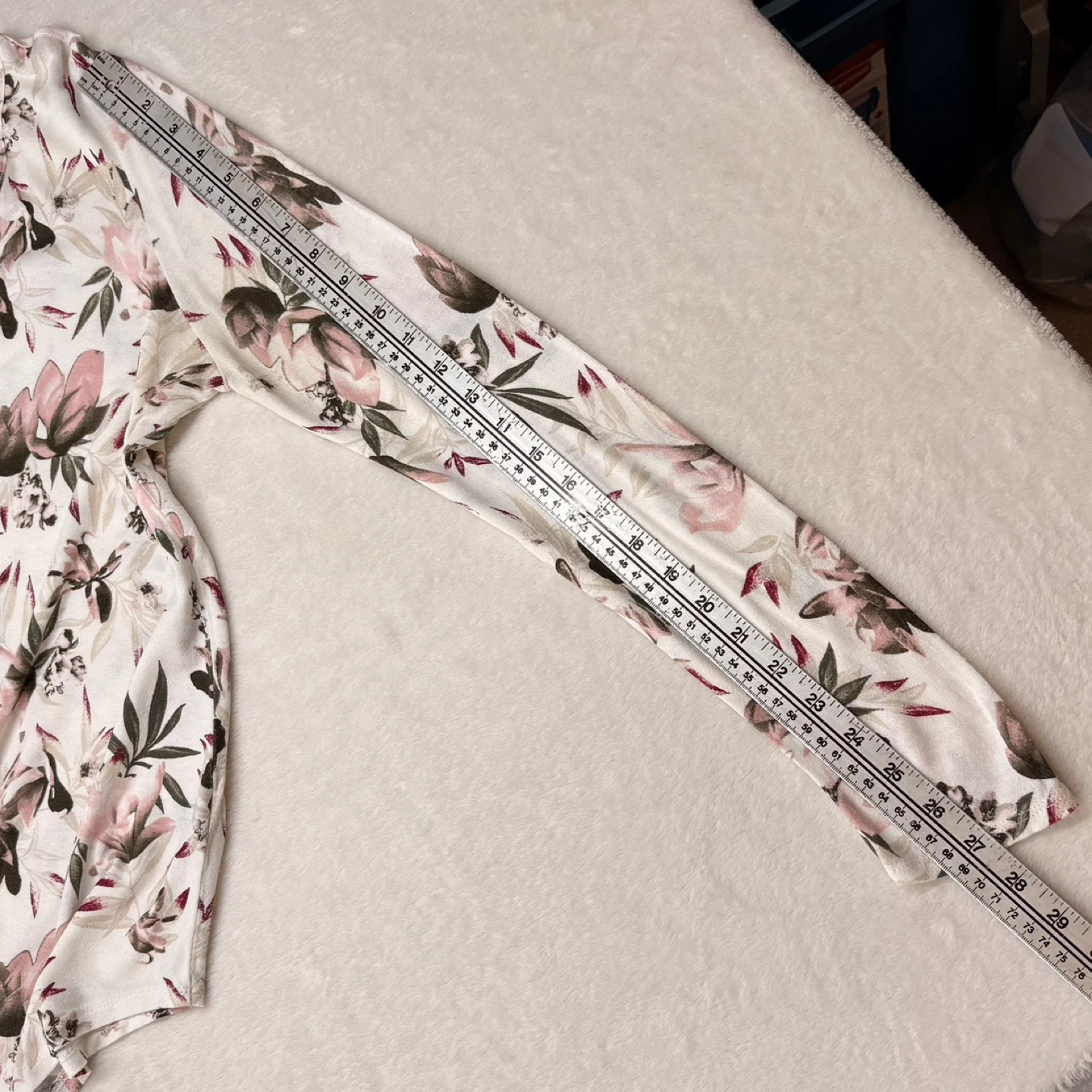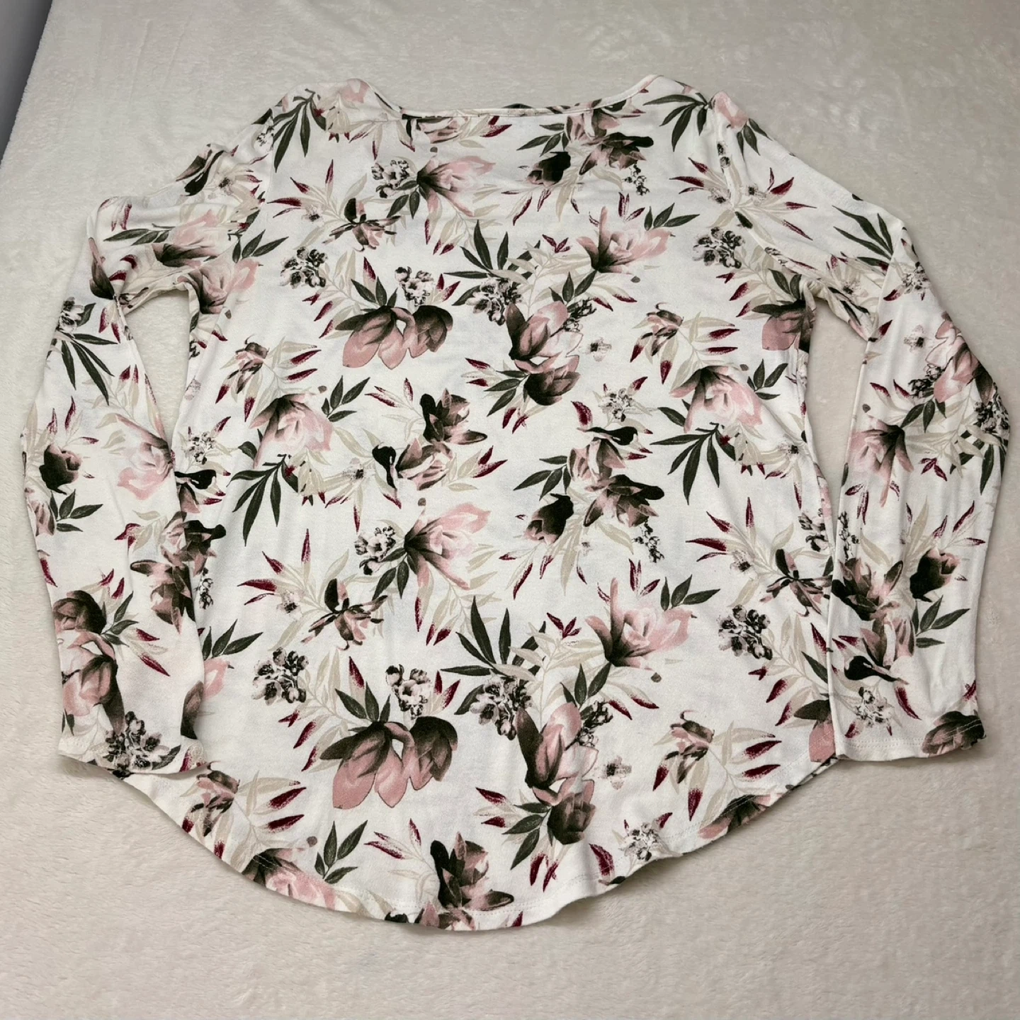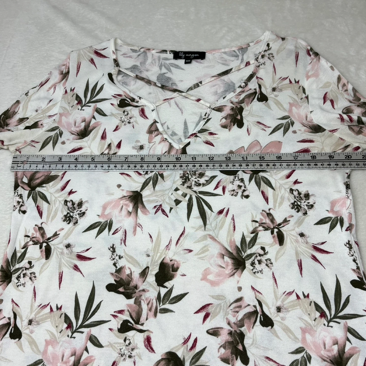This beautiful Lily Morgan top features a soft white fabric with a pink and green floral print. It has a relaxed fit, long sleeves, and a stylish criss-cross detail at the V-neckline. While the tag is a Medium, it has a generous cut that fits more like a Large. Perfect for casual wear or layering, this top offers a comfortable yet put-together look.