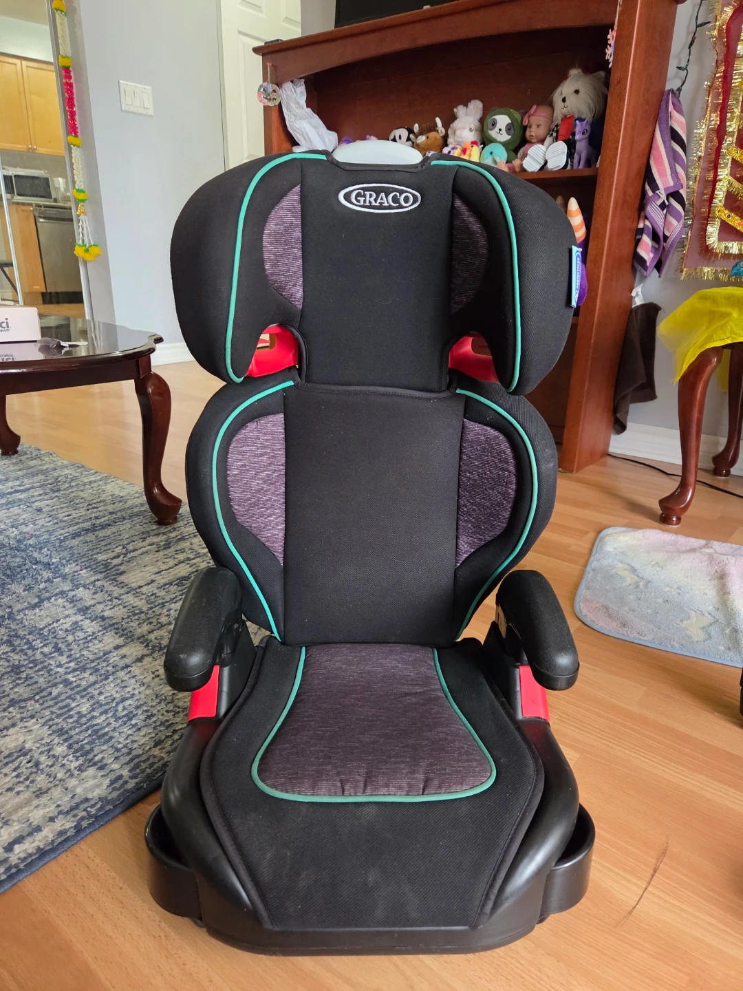 This is a Graco booster car seat in black with purple and teal accents. It has padded armrests and a cup holder. It's designed for children who have outgrown a forward-facing harness.good for 4 year to 8 year child