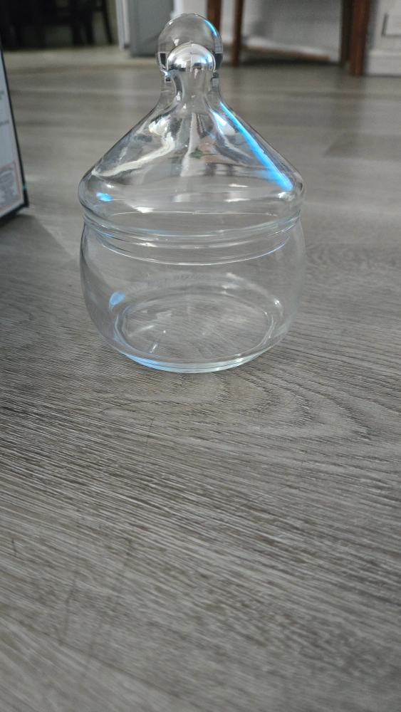 Selling a clear glass jar with a lid. It's in great condition and perfect for storing small items or using as a decorative piece! It has a classic design that would fit well in any home