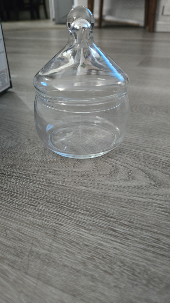 Selling a clear glass jar with a lid. It's in great condition and perfect for storing small items or using as a decorative piece! It has a classic design that would fit well in any home
