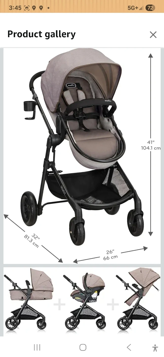 This Evenflo travel system includes a stroller and infant car seat. The stroller's dimensions are 32" x 26" x 41". It's a versatile option for families on the go!