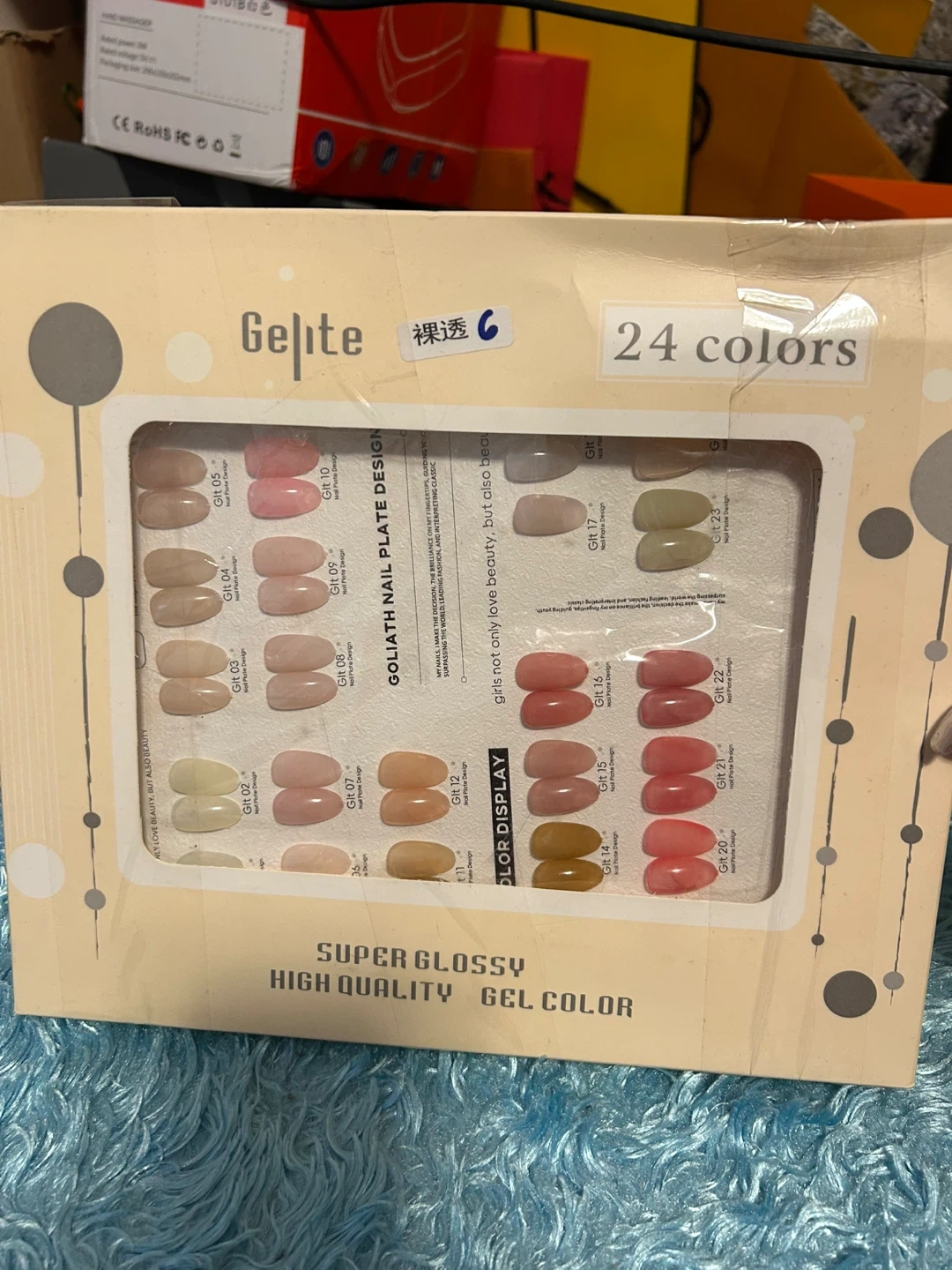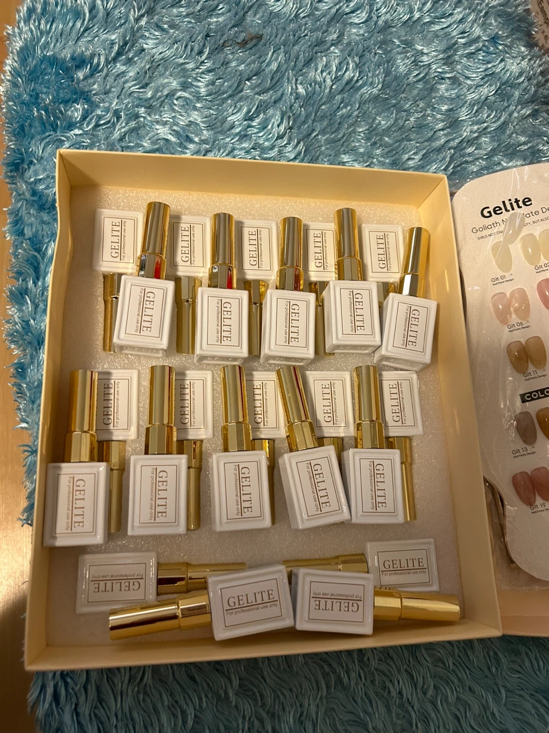 This set includes 24 colors of Gelite super glossy high quality gel polish. It's perfect for creating a variety of nail designs. Each bottle is designed for professional use.