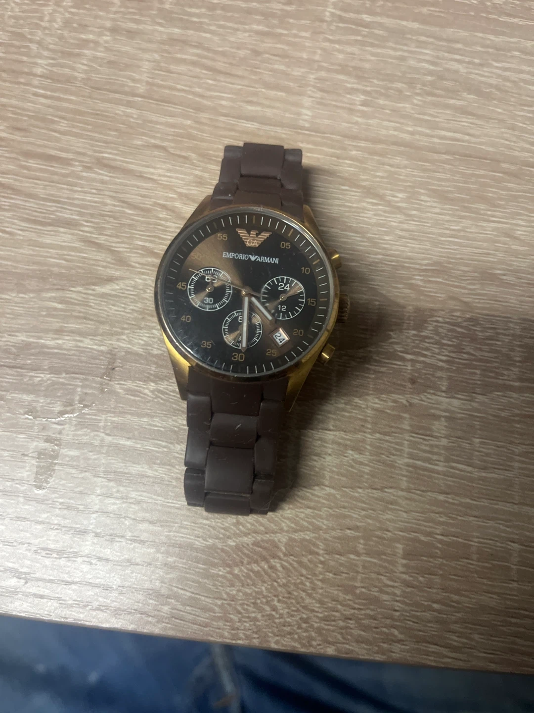 This is an Emporio Armani chronograph watch with a brown band and gold-tone case. It features a black dial with sub-dials and a date window. The watch has a quartz movement.