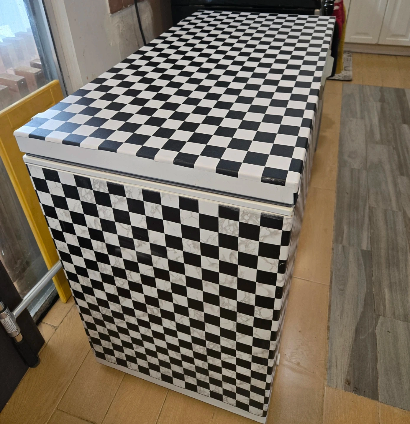 This chest freezer is white inside and features a fun checkered and marble decal on the exterior. It includes a removable wire basket for organization. Keeps your food frozen solid!