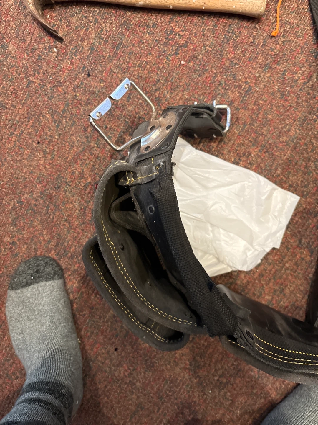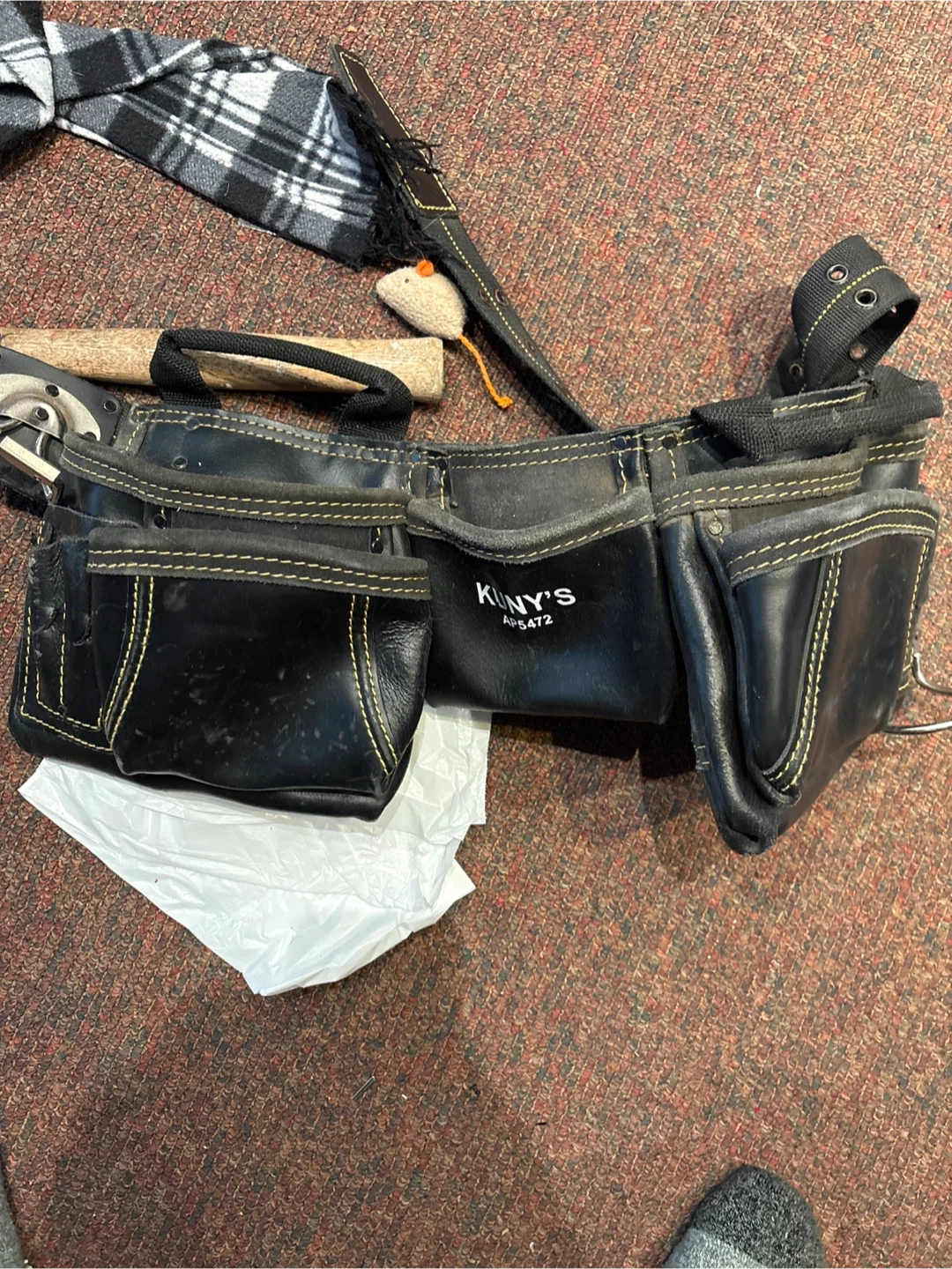 This is a heavy-duty tool belt with multiple pouches for organizing tools. It's made from durable black leather with reinforced stitching. Includes a steel hammer loop and adjustable belt.