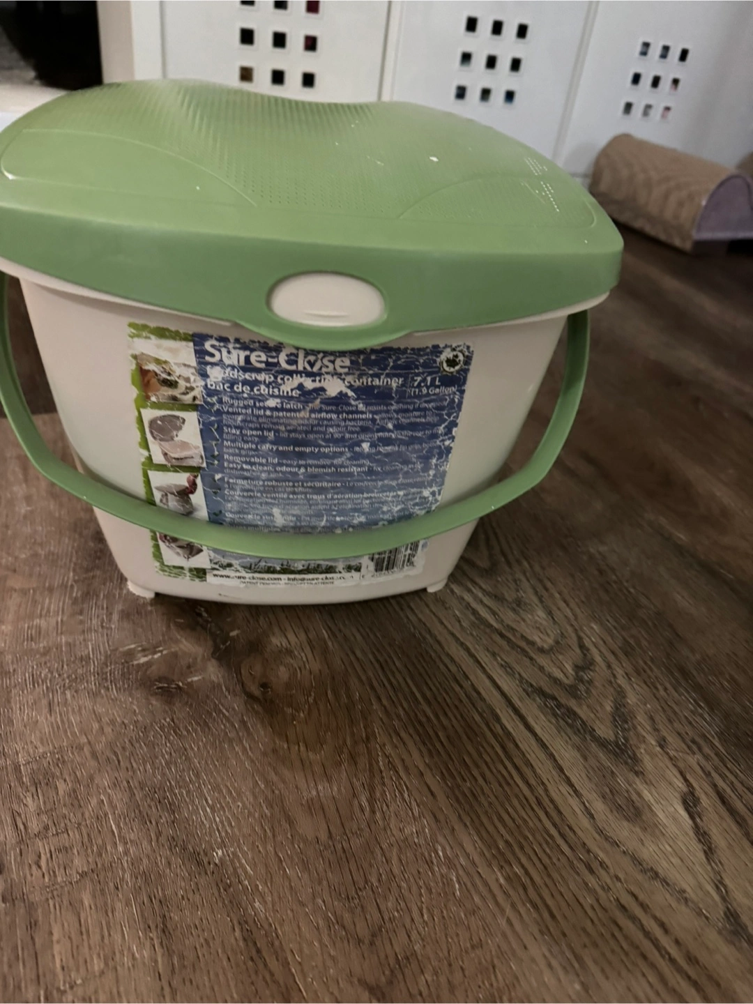 Selling a Sure-Close food scraps collection container! It holds 7.1 L (1.9 Gallons). It features a rugged, secure latch and a vented lid with patented airflow channels. The lid is removable for easy cleaning and it's dishwasher safe