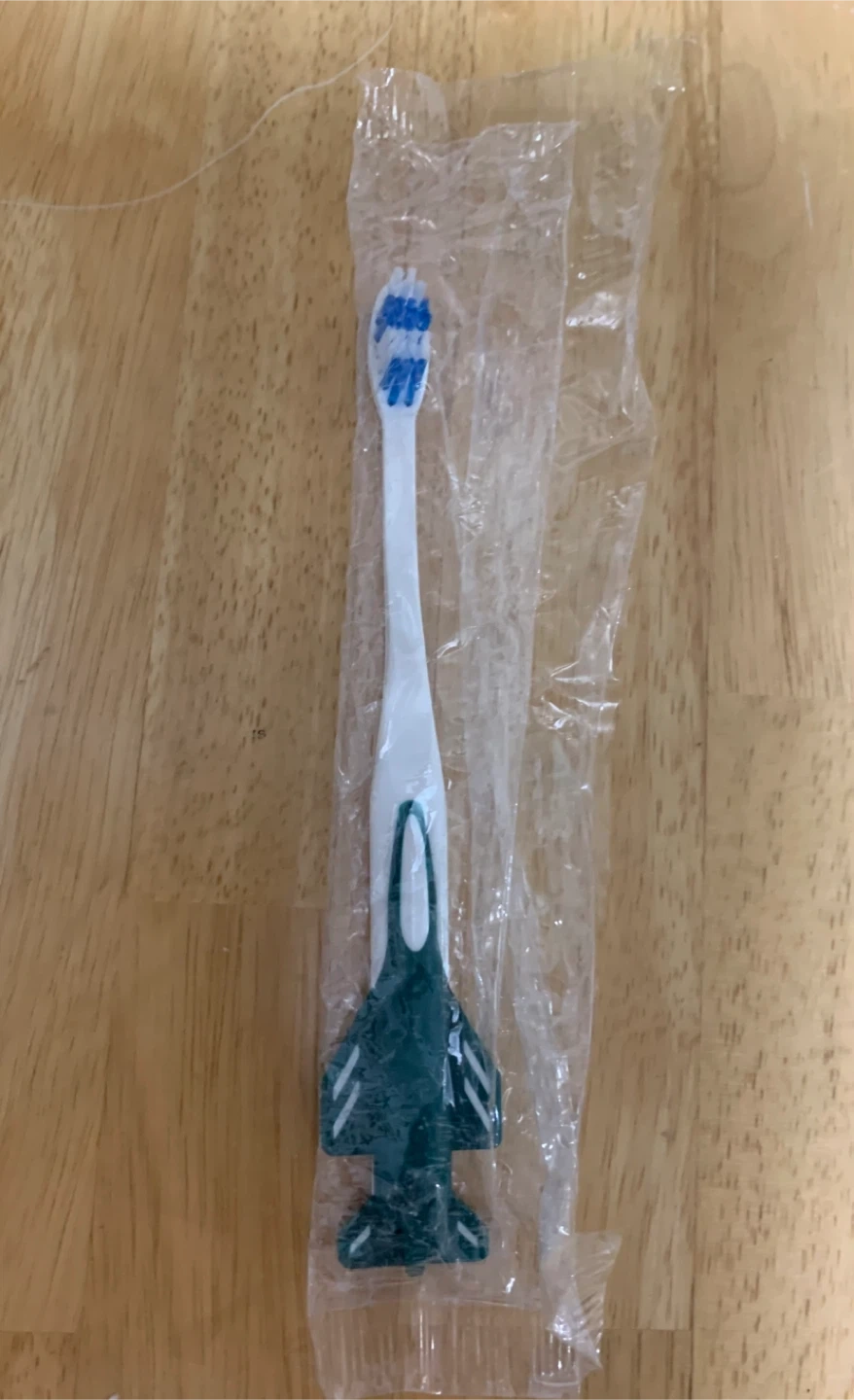 White toothbrush with blue and white bristles. Features a fun green airplane-shaped handle.