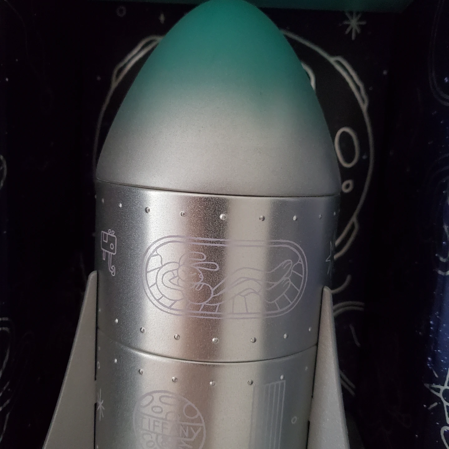 Extremely Rare - Authentic Tiffany & Co. Moon Festival Rocket Tin Can VIP Jewelry Box Limited Edition item. It's a decorative piece with a unique space-themed design. The rocket is silver with a gradient green tip.