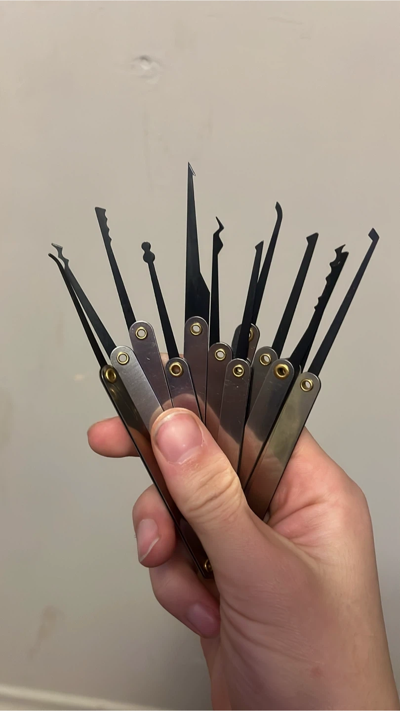 Selling a lock pick set, perfect for hobbyists or those interested in learning about lock mechanisms. It comes with a variety if lock picks