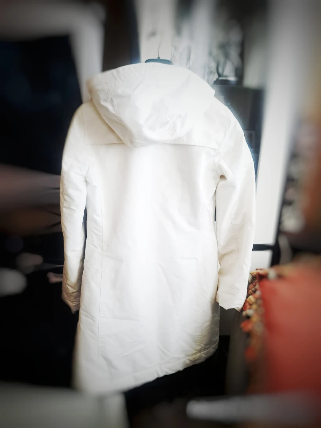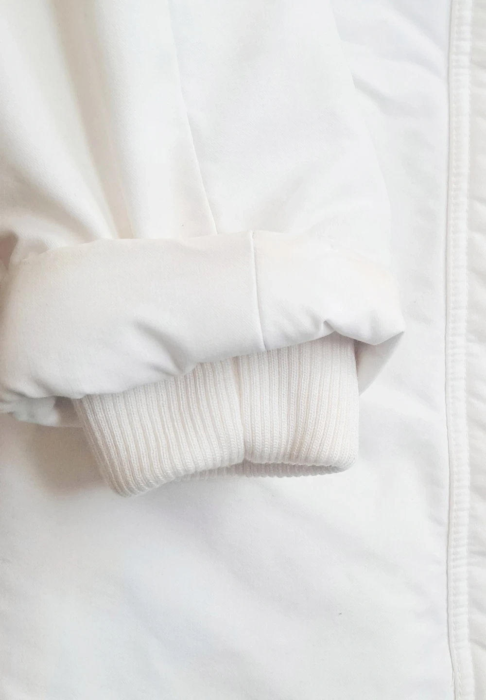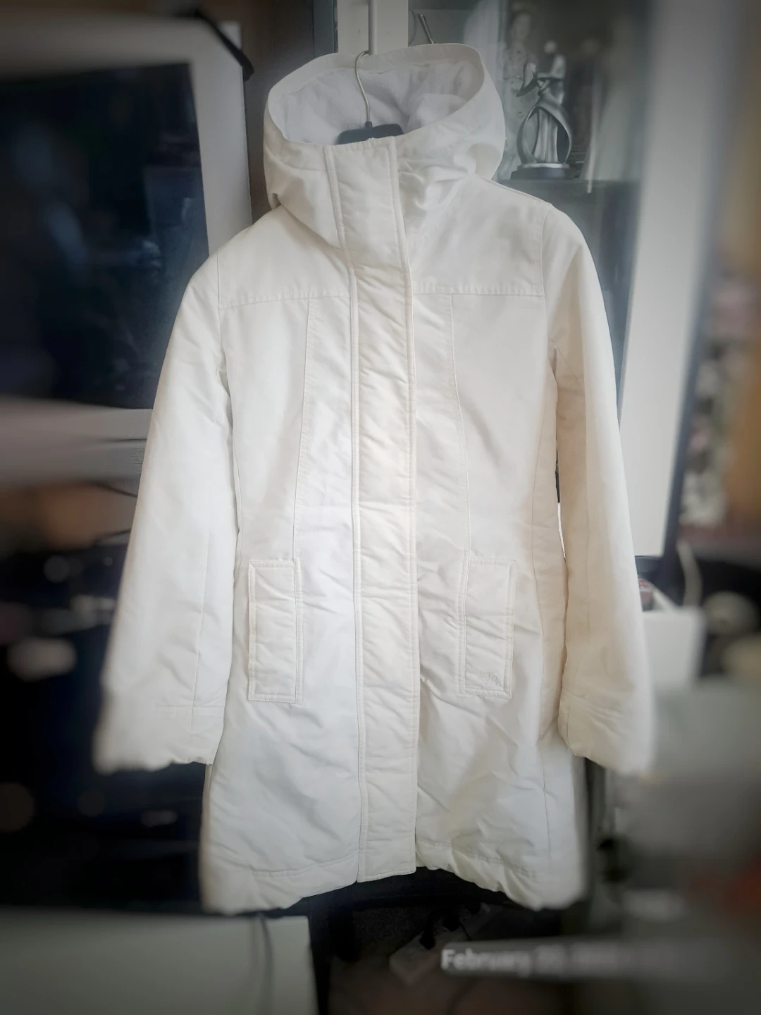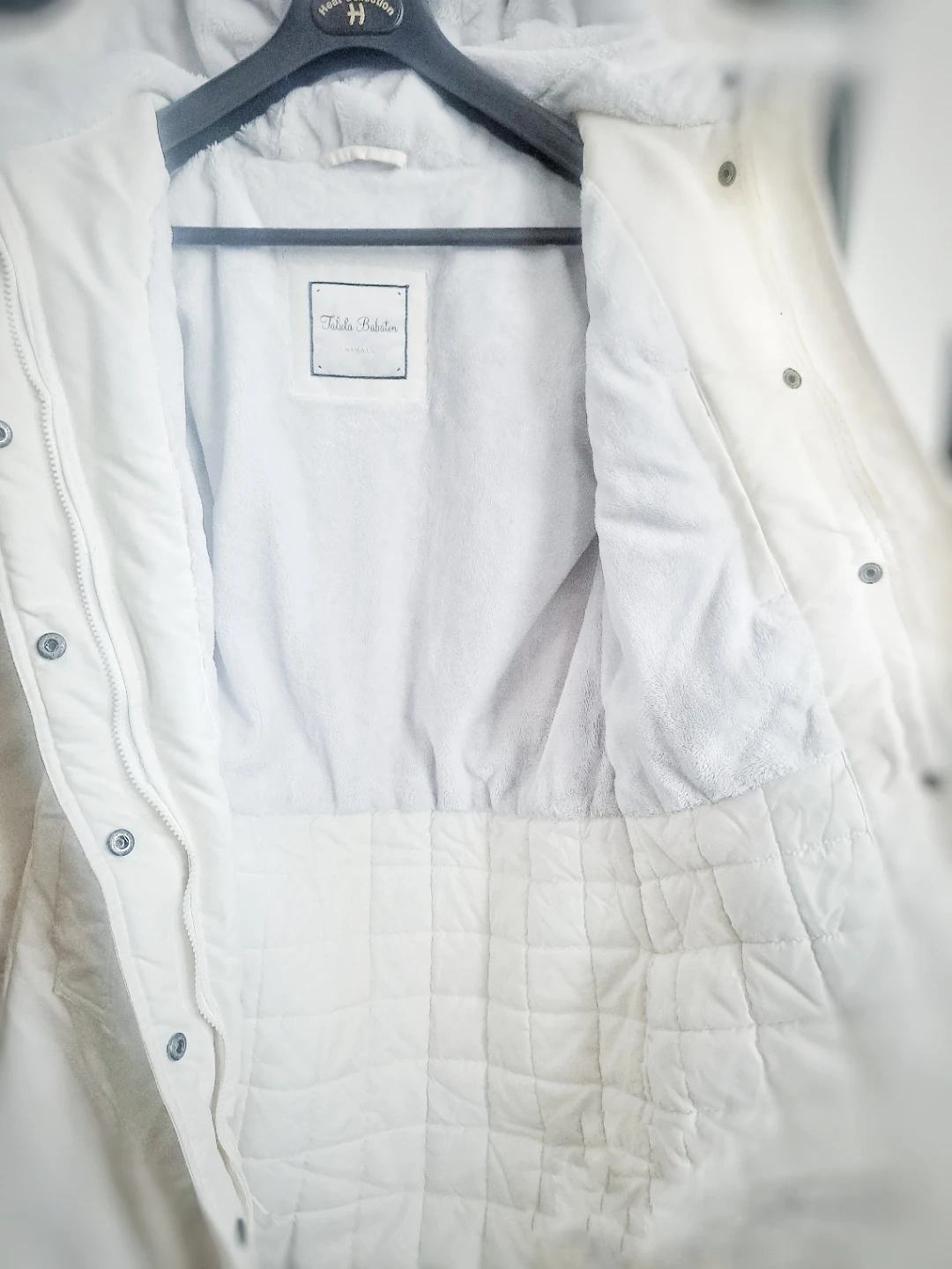 Talula Babaton: hooded winter coat in white. Features a fleece-lined interior and ribbed cuffs for extra warmth. This coat is great for staying cozy during colder months!