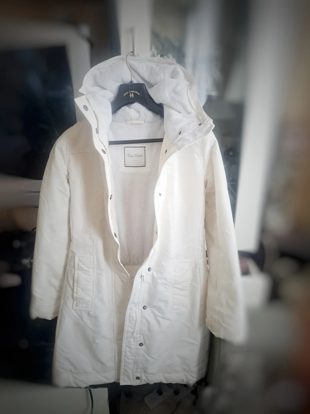 Talula Babaton: hooded winter coat in white. Features a fleece-lined interior and ribbed cuffs for extra warmth. This coat is great for staying cozy during colder months!