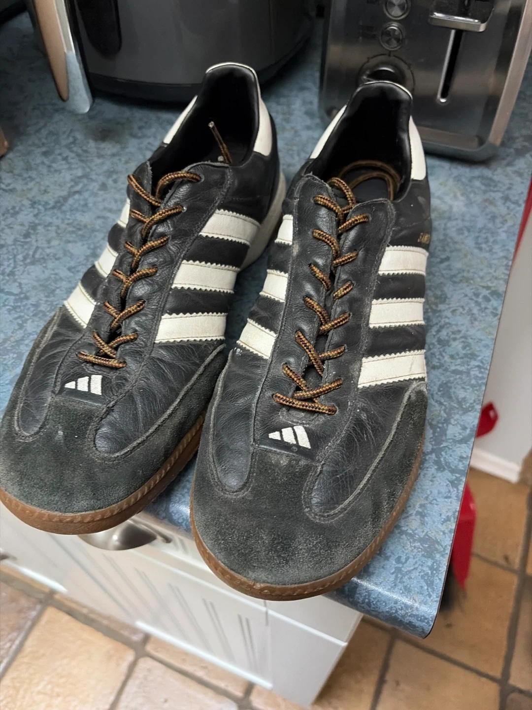 Classic Adidas sneakers in black with white stripes. Features a suede toe cap and durable rubber sole. These kicks offer a retro look for everyday wear.