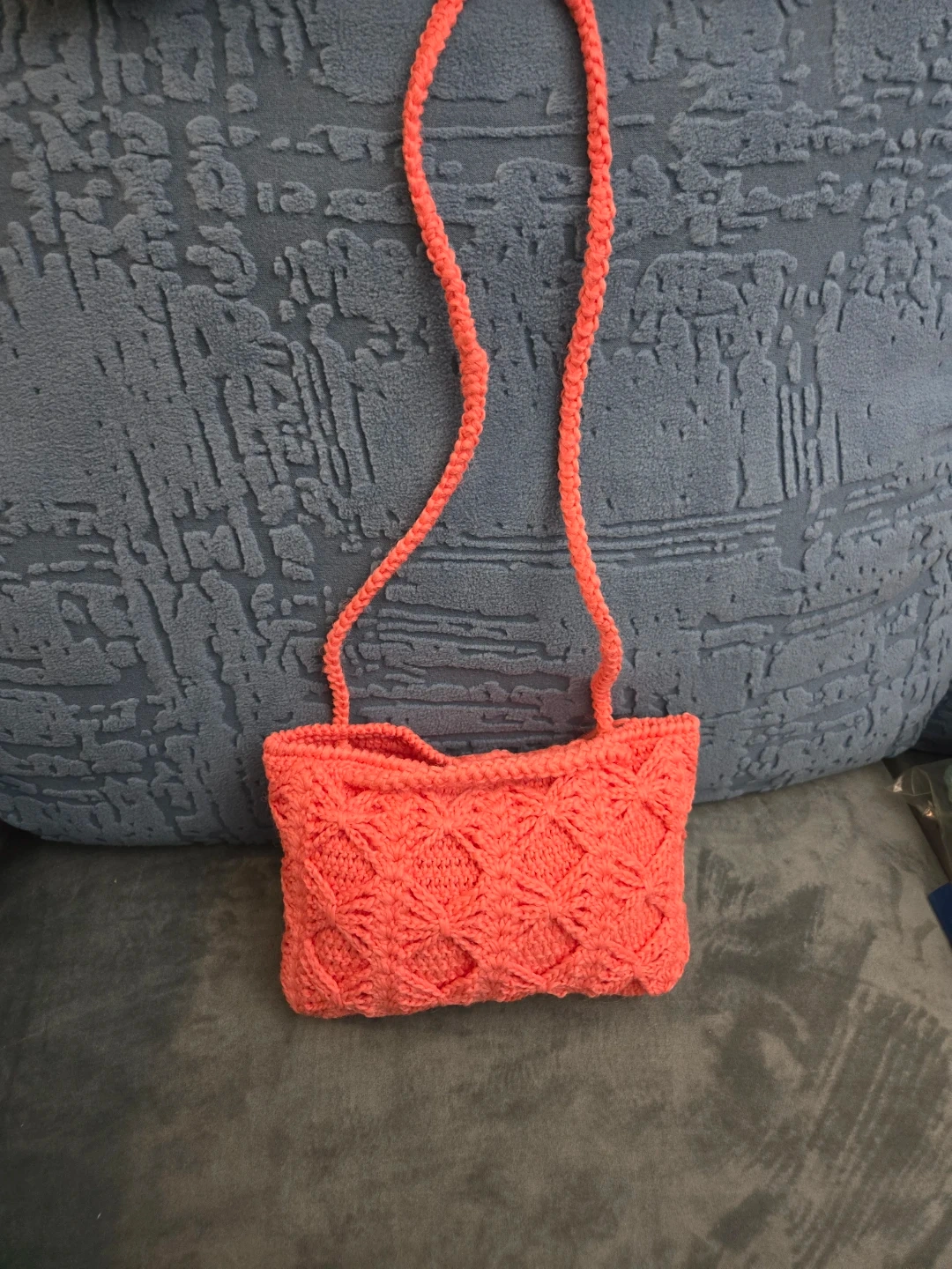 handmade crochet purse in a beautiful coral pink colour. Has a diamond pattern throughout. The braided straps are sturdy, comfortable and allow the purse to be worn as a crossbody/shoulder purse or a handbag