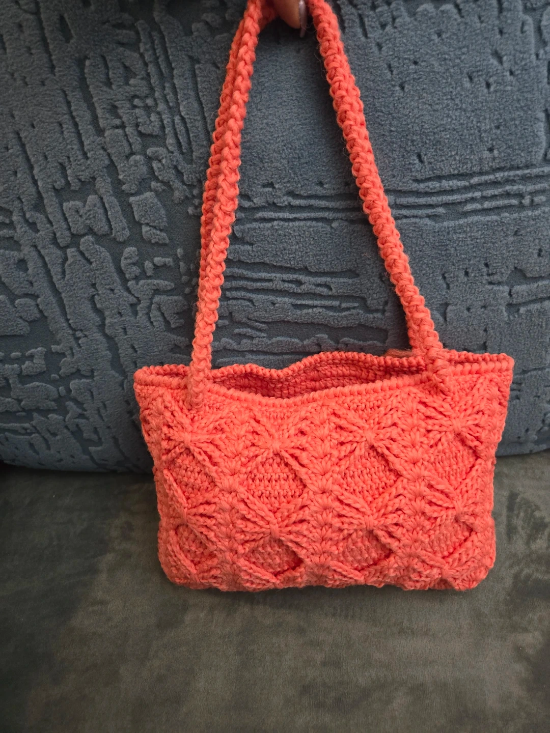 handmade crochet purse in a beautiful coral pink colour. Has a diamond pattern throughout. The braided straps are sturdy, comfortable and allow the purse to be worn as a crossbody/shoulder purse or a handbag