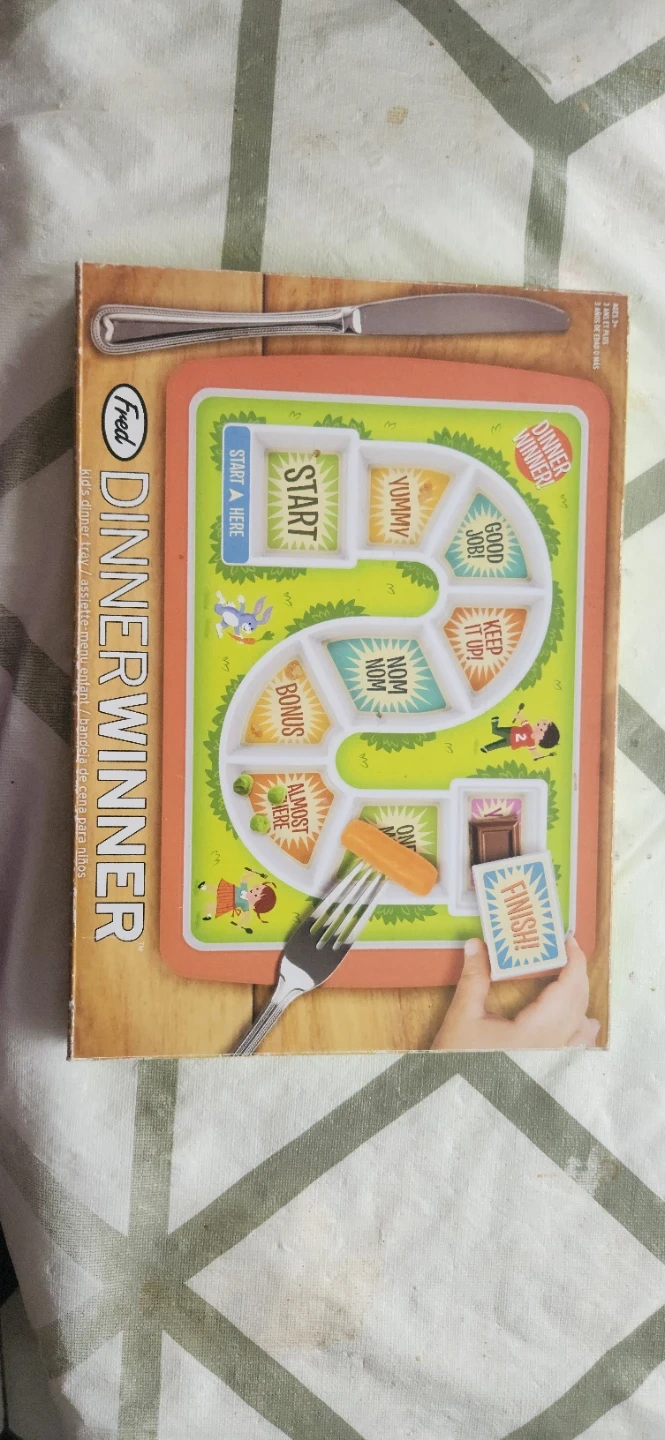 Fred DinnerWinner divided plate for kids. It features different sections like 'Start Here', 'Yummy', 'Nom Nom', and 'Finish'. This plate helps make mealtime fun for picky eaters!