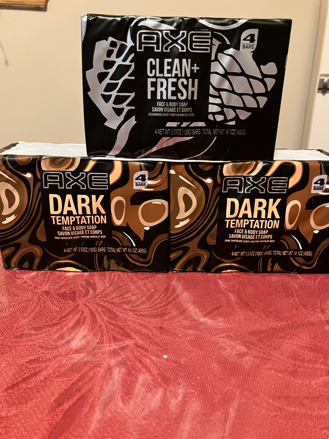 3 packs of 4-bar each pack of Axe face and body soap. One pack is Clean+Fresh with a cedarwood scent, and the other two packs of Dark Temptation with a dark chocolate scent. Each bar weighs 3.53oz. BRAND NEW
