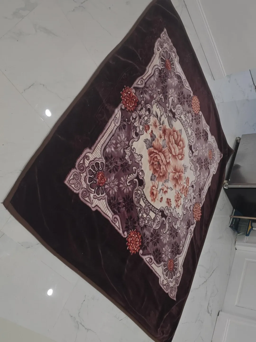 Cozy plush blanket featuring a detailed floral design. It's brown with cream, purple, and red accents. Great for adding warmth and style to any room!