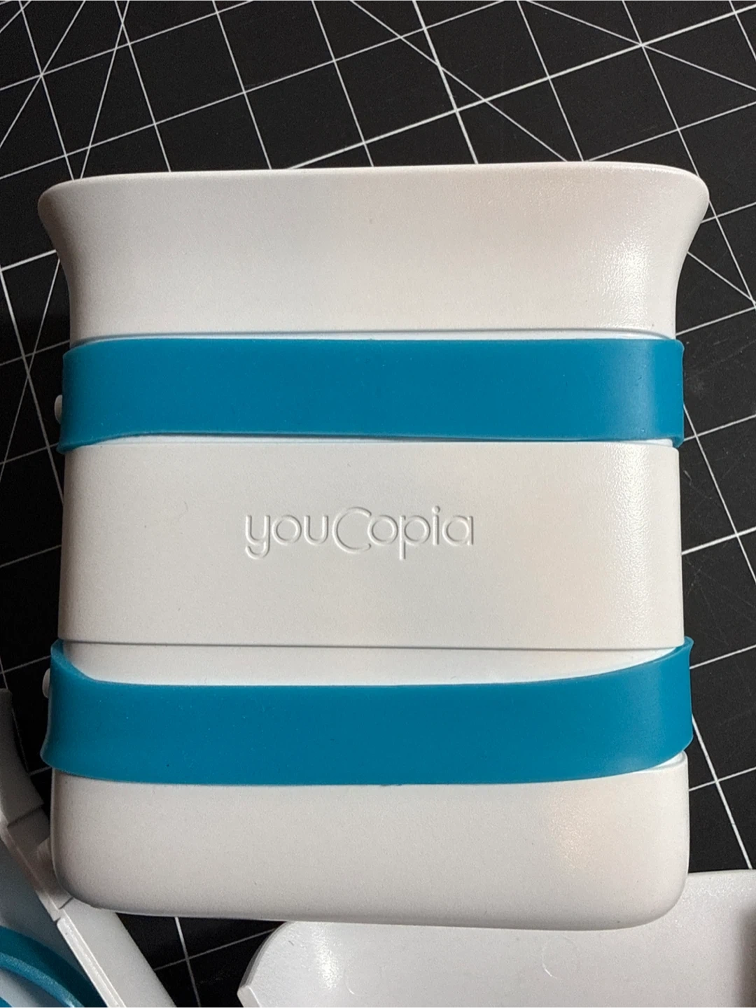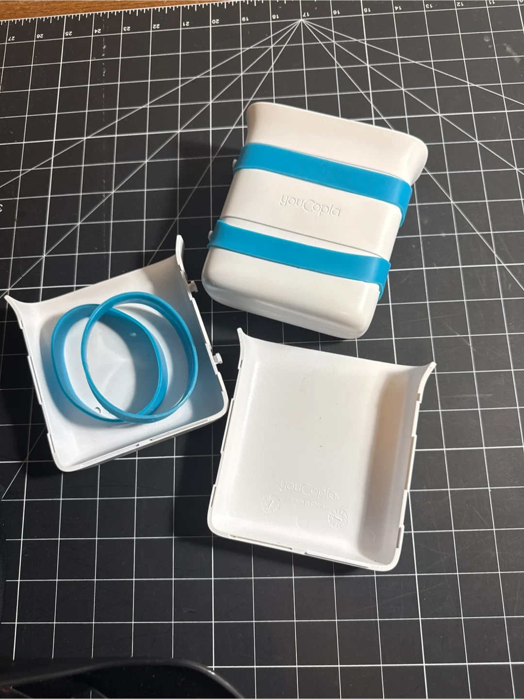 This YouCopia food storage container is white with blue accents. It's made of plastic and includes two blue bands. Freezer mould for meal planning