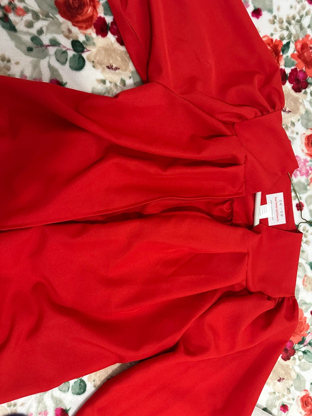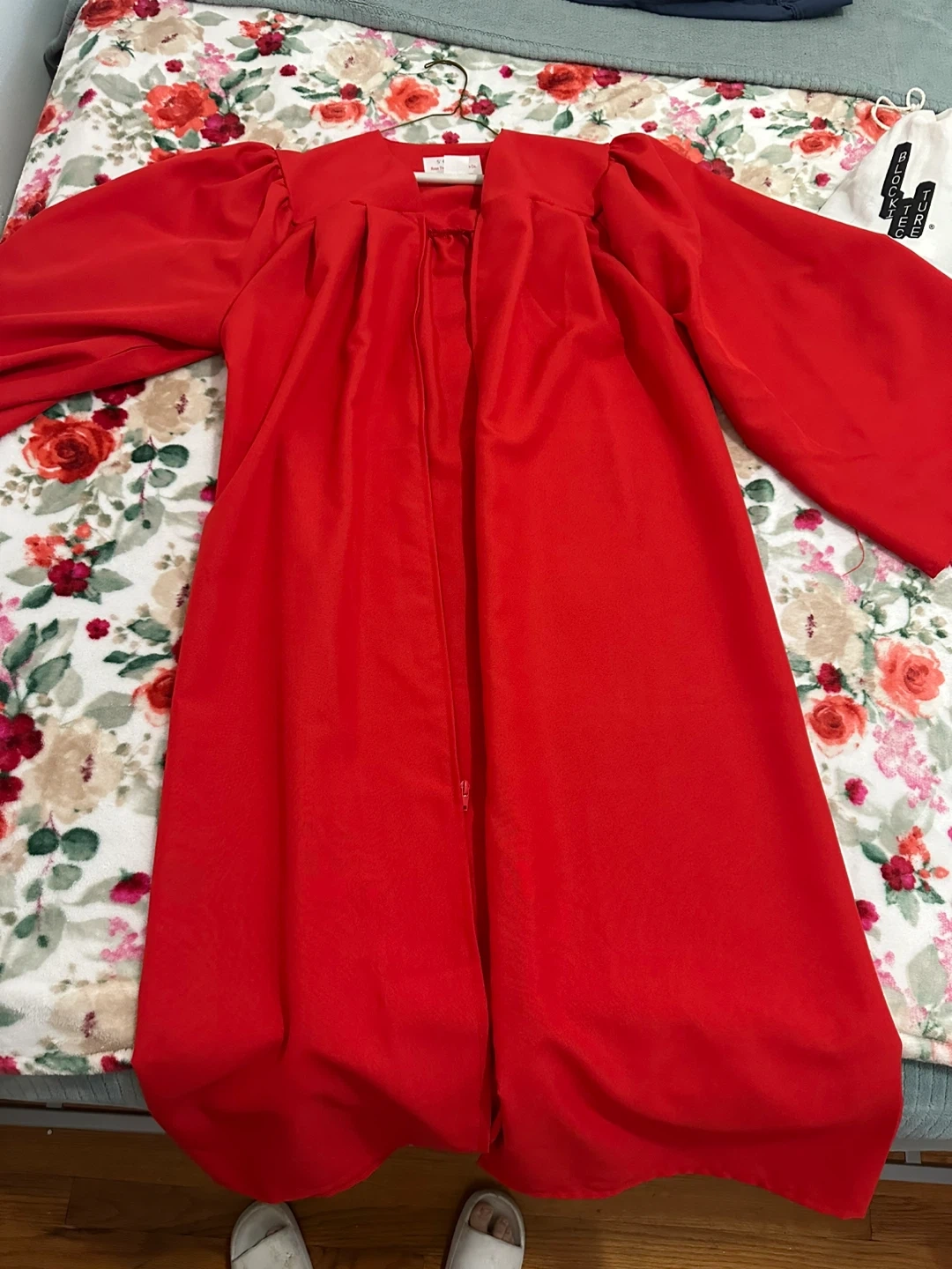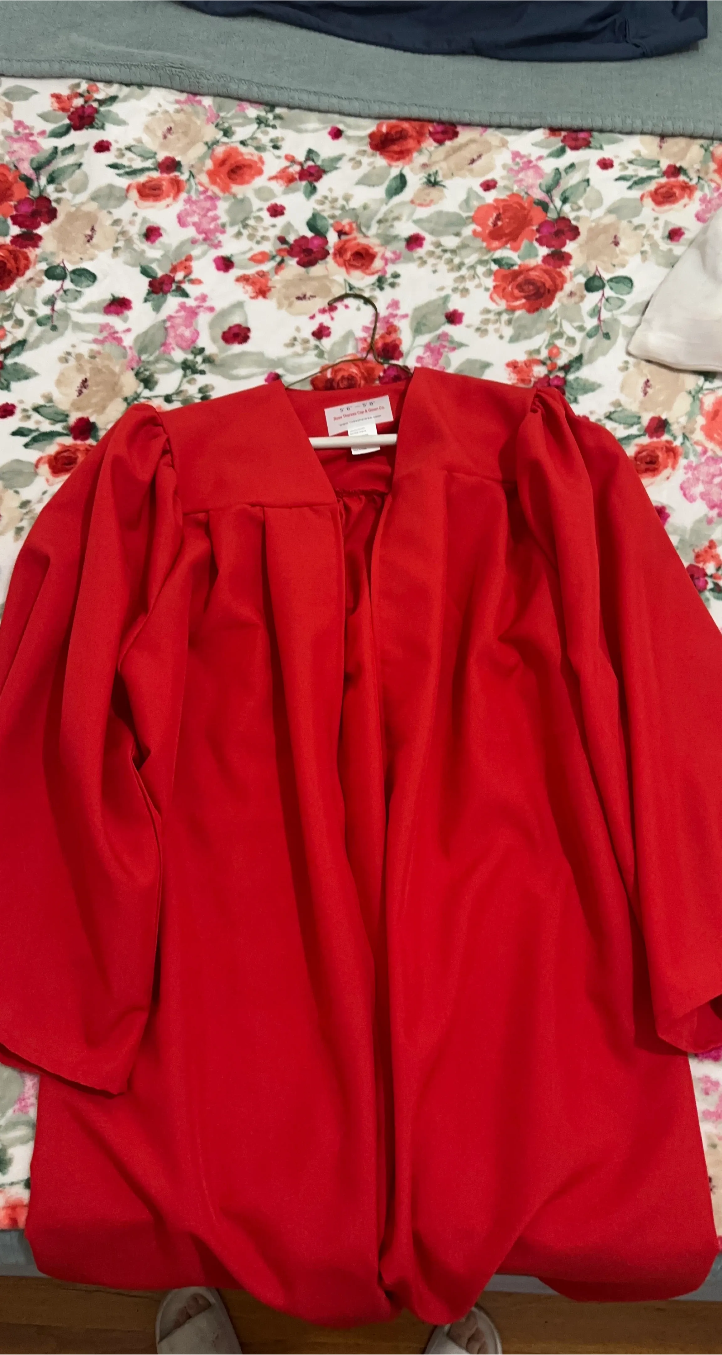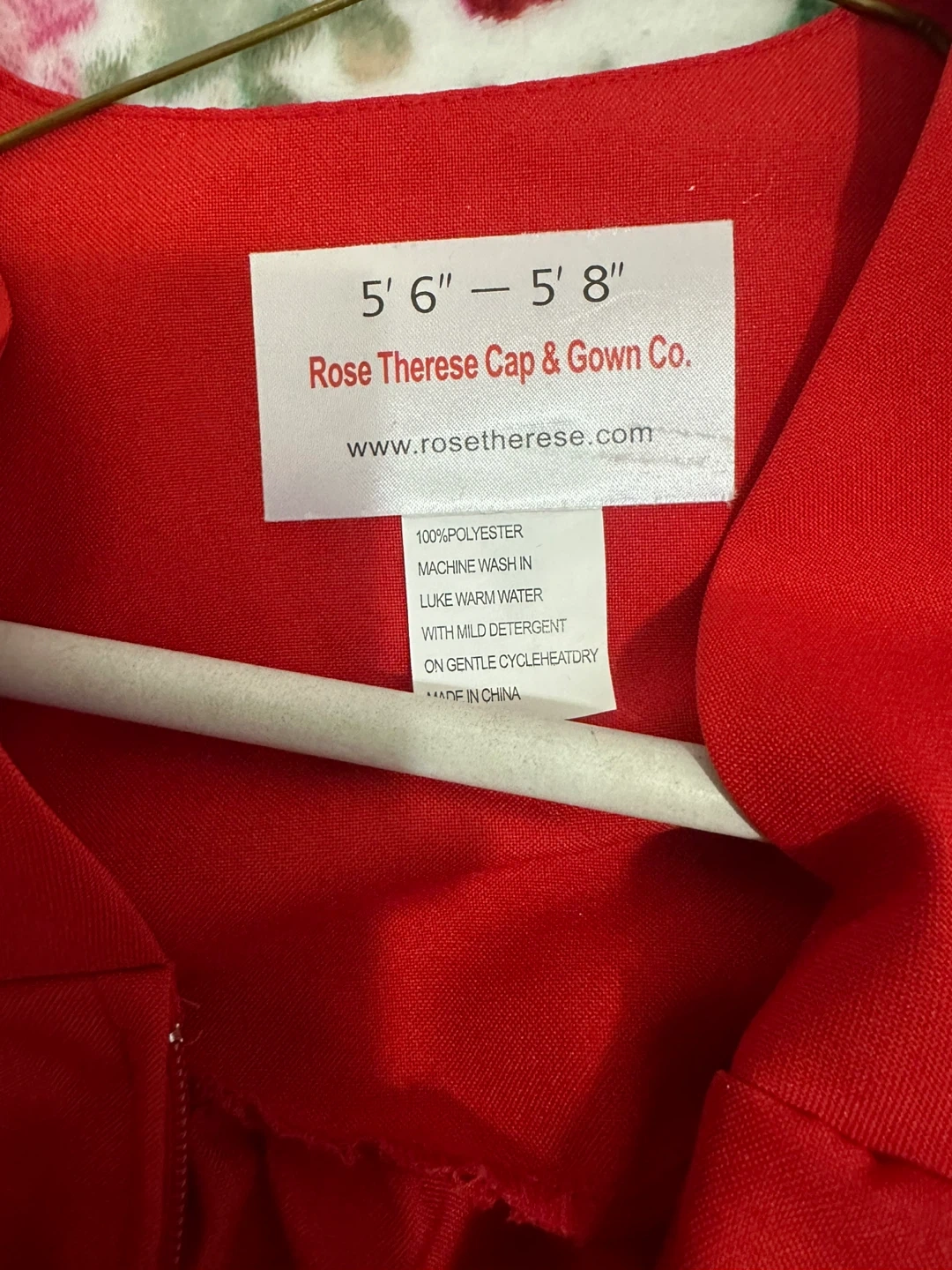 Red graduation gown from Rose Therese Cap & Gown Co. Made of 100% polyester. Recommended for heights 5' 6" to 5' 8". Machine wash in lukewarm water with mild detergent.