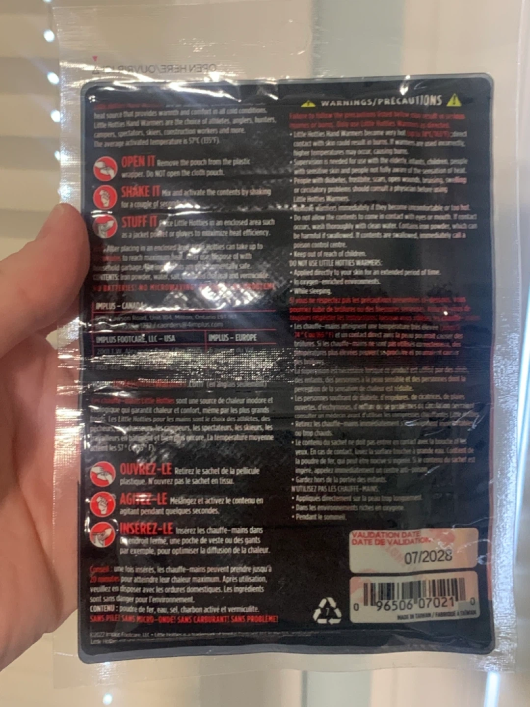 Keep your hands toasty with these Little Hotties hand warmers! Each pair provides up to 10 hours of pure heat. They're air-activated, safe, natural, and odourless. The expiration date is July 2028.