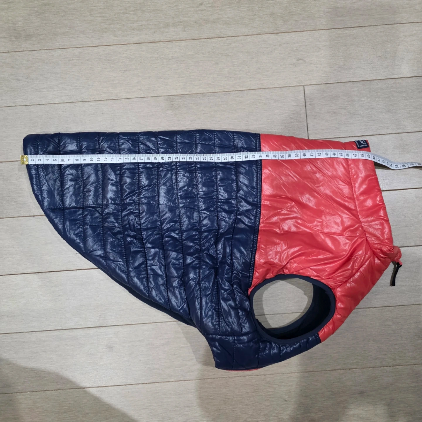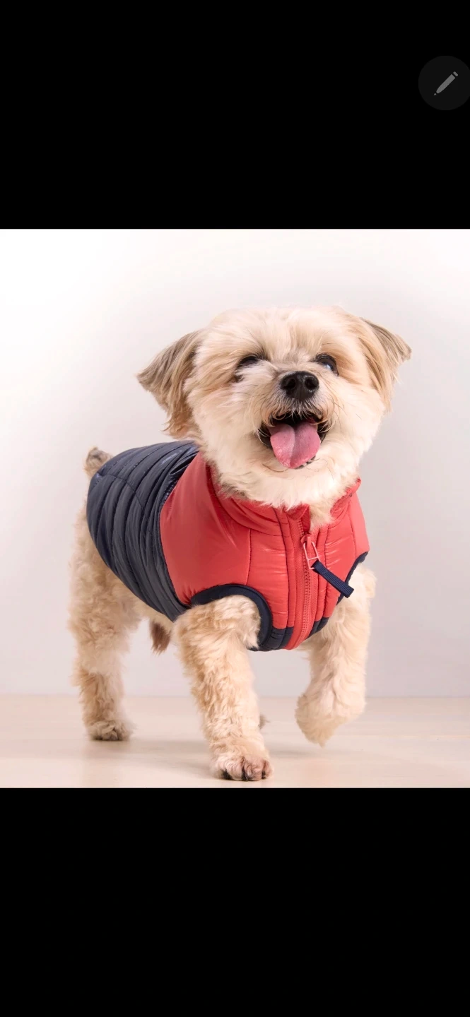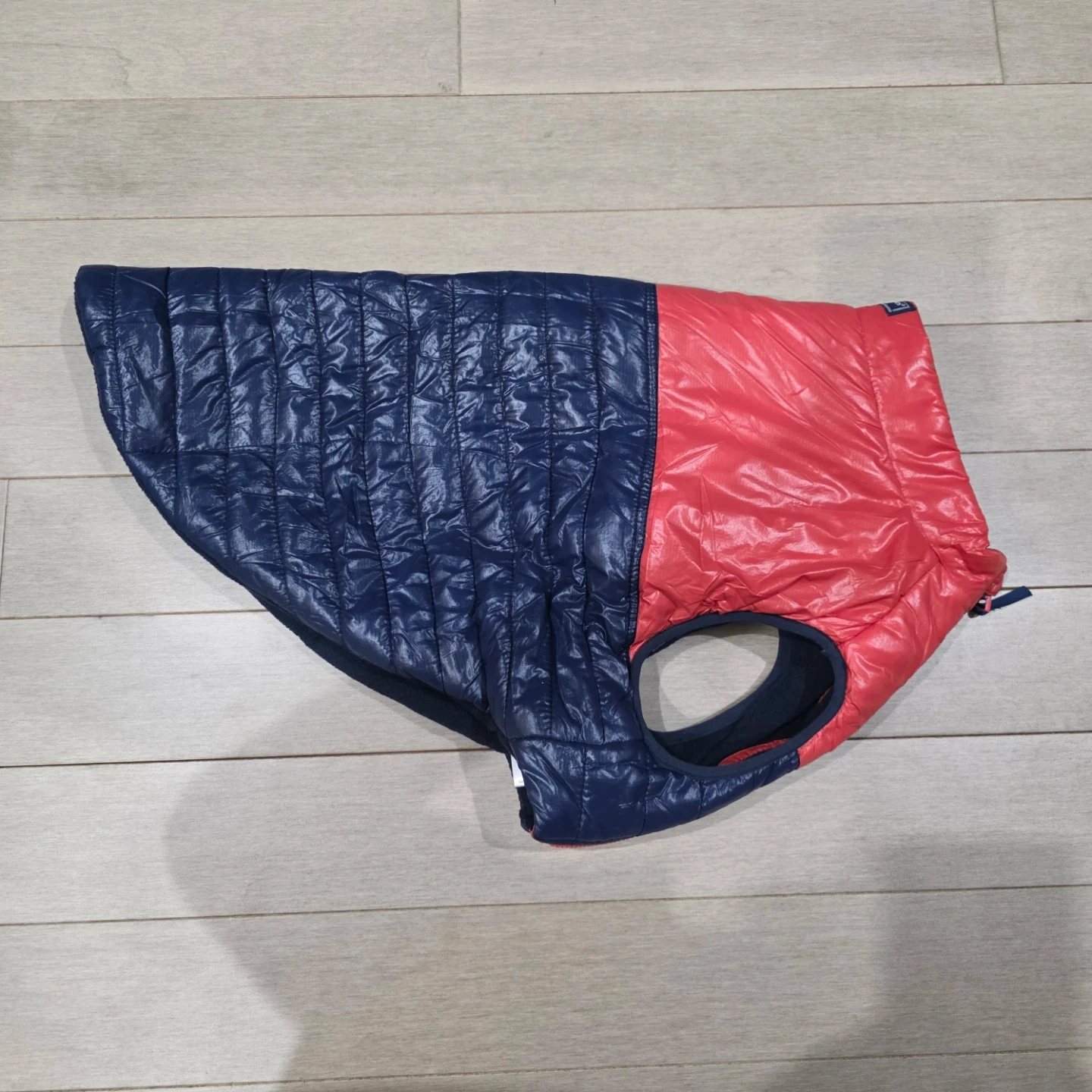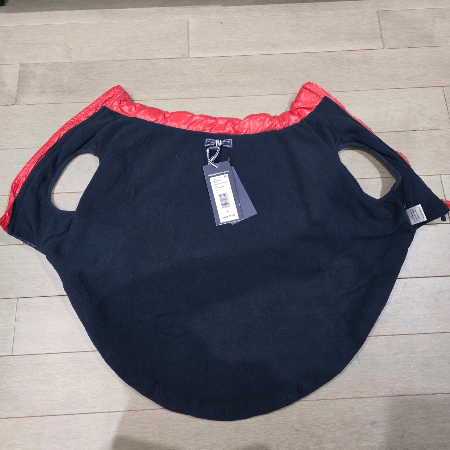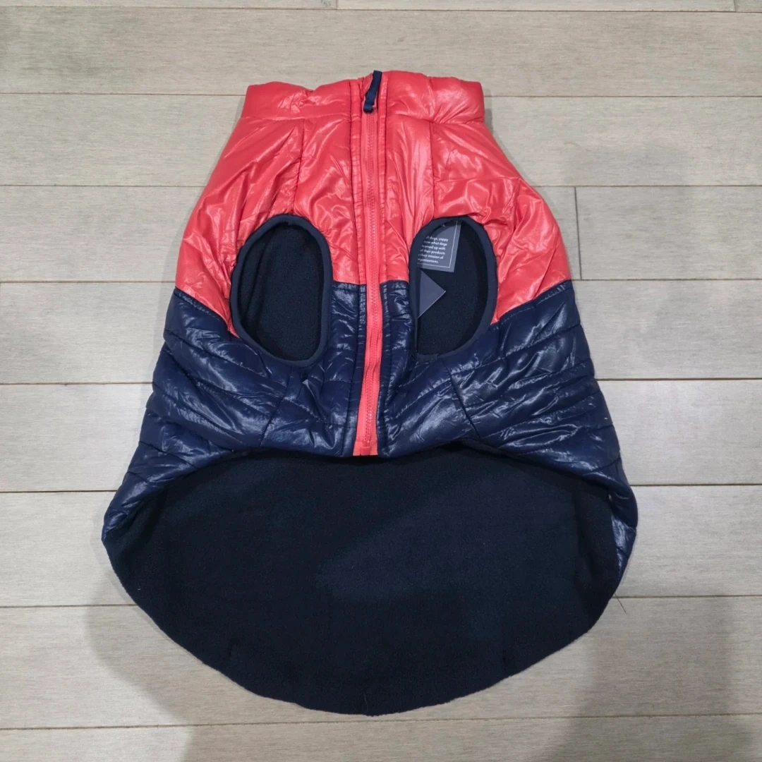 This Vineyard Vines dog vest is quilted and features a red and navy color block design. It has a soft fleece lining for warmth. Zipper closure with velcro fasteners. Size L.