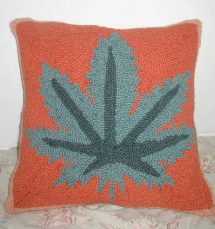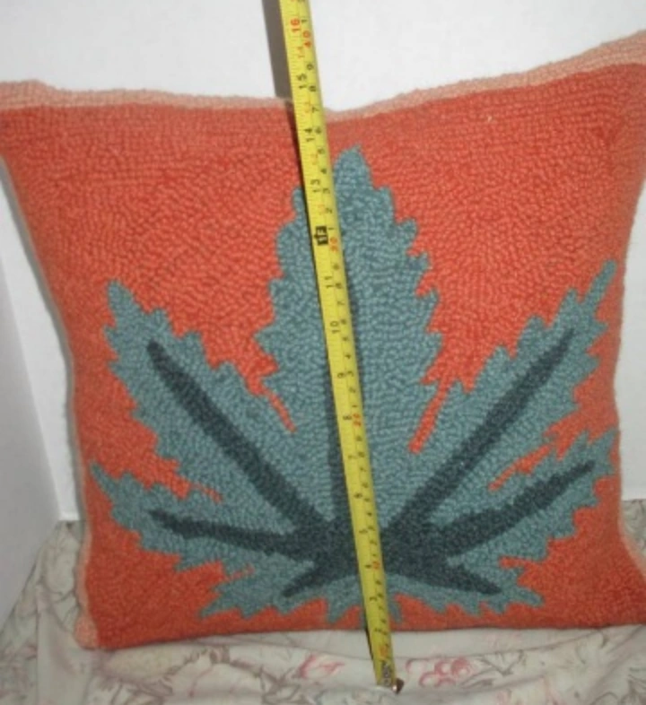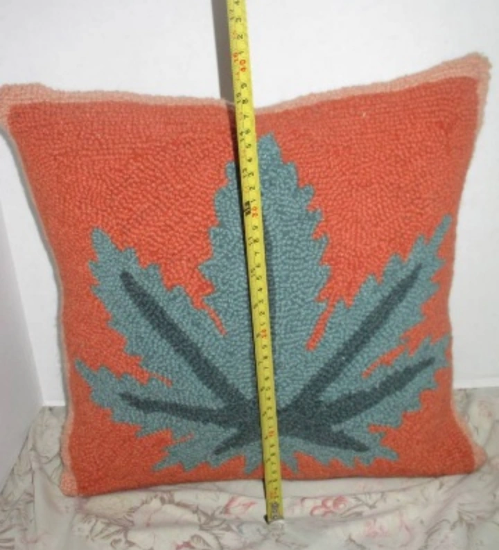 Cozy up your space with this unique handmade hooked pillow! It features a cool leaf design in shades of green and orange. It measures approximately 15 inches square, perfect for adding a touch of charm to your couch or bed. perfect gift for the stoner in your life. pickup in Astoria Queens
