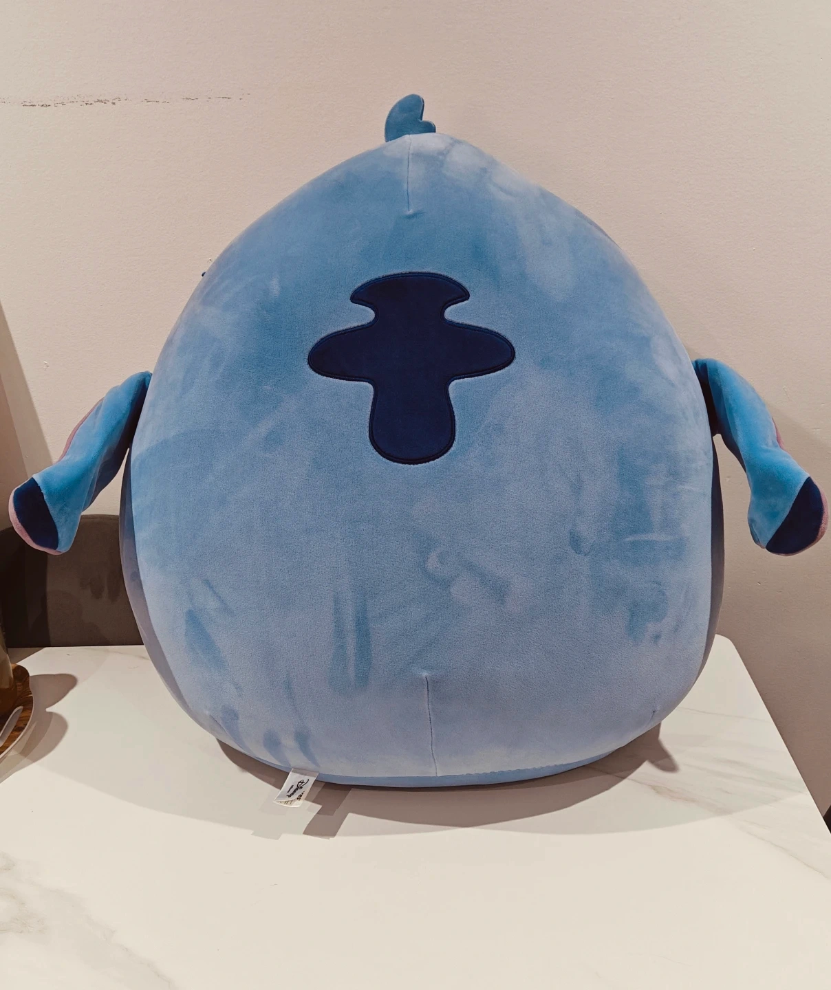 This is a large, soft blue plush toy featuring the character Stitch from Disney. It's incredibly huggable and made for cuddling. A fun addition for any Disney fan's collection!