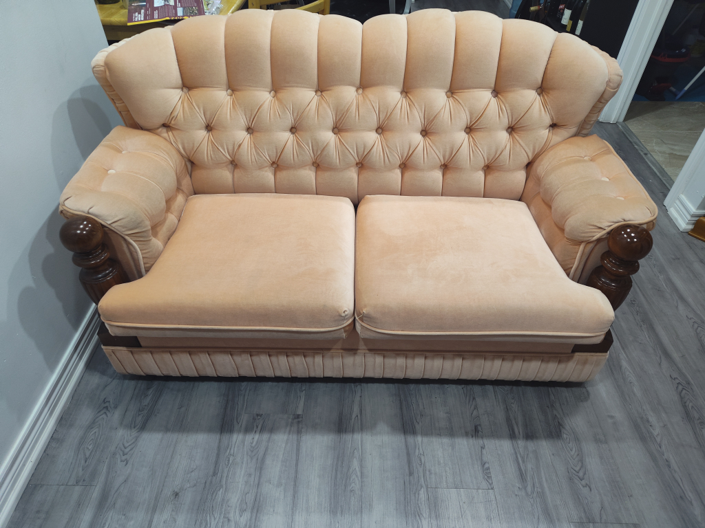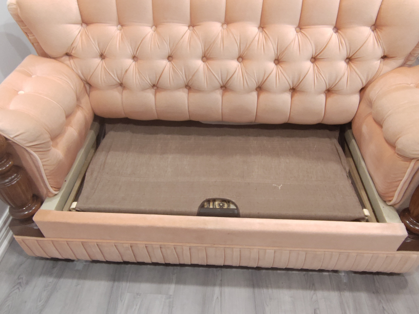 Pull out sofa bed. Made of hard wood and steel frame. Original mattress made in Canada. It has wheels. Peach velvet fabric. Firm foam seat cushions. Well taken care of, pet and smoke free home.
