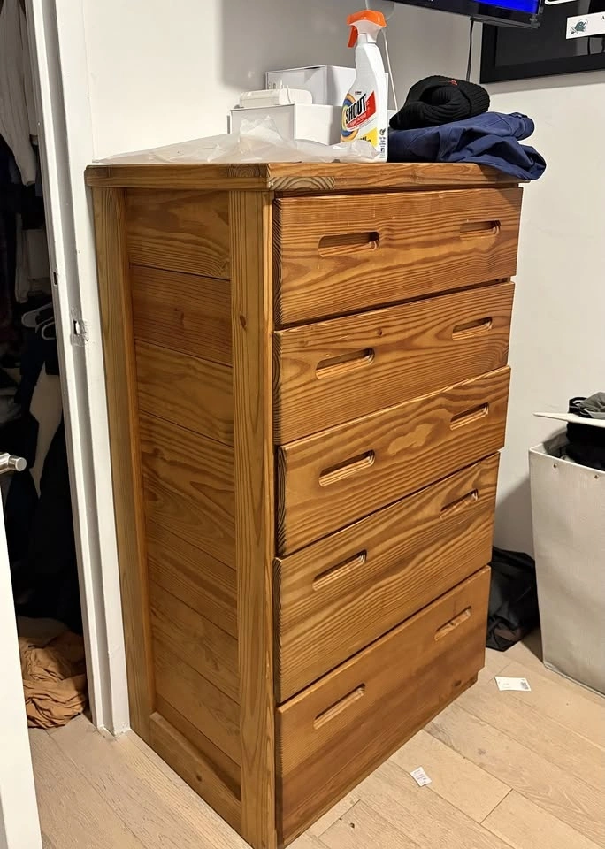 Heavy, solid wood dresser with a warm natural finish and clean, modern lines. Features five spacious drawers with built-in wood pull handles for a sleek look. 5 deep drawers with smooth glide. Solid wood construction. Sturdy and durable. Neutral tone that fits most bedrooms. Plenty of storage for clothes, linens, or essentials. In good condition with normal light wear from use. All drawers open and close properly. Perfect for a bedroom, guest room, or apartment setup. Message for dimensions or pickup details!