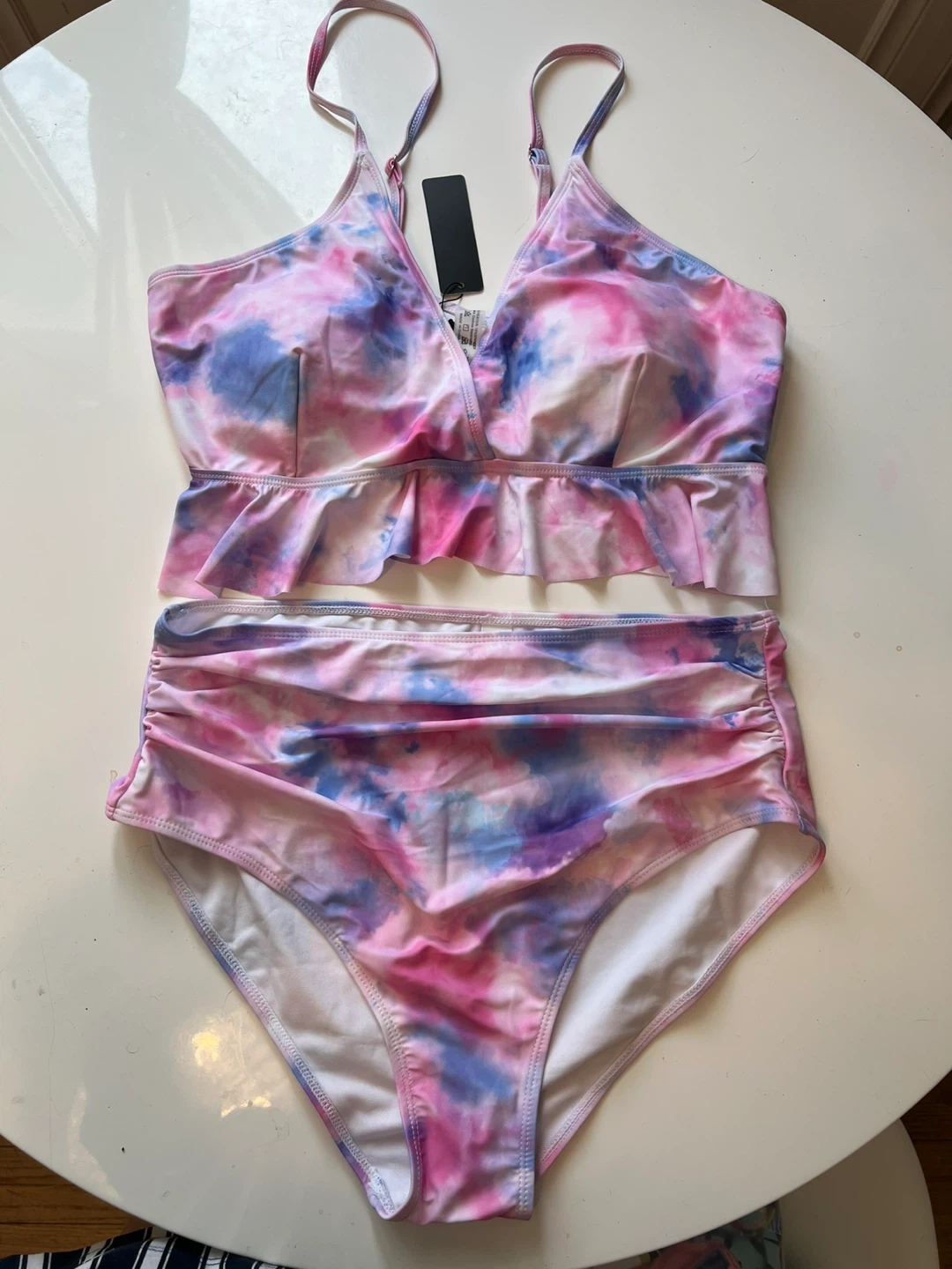 This women's bikini set features a vibrant pink, blue, and purple tie-dye pattern. It includes a ruffled tankini-style top with adjustable straps and high-waisted bottoms with ruched detailing. Size is XXL.Price is firm but will give a discount for multiple items.