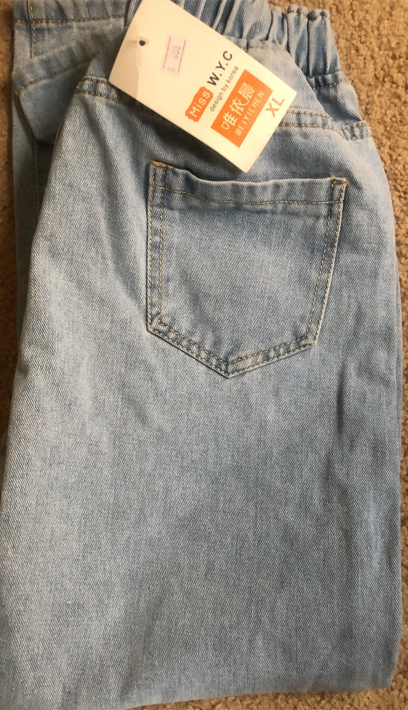 Light wash denim jeans from Miss W.Y.C. Size XL with an elastic waistband and drawstring. These jeans are made from denim material. They're a comfy option for casual wear!