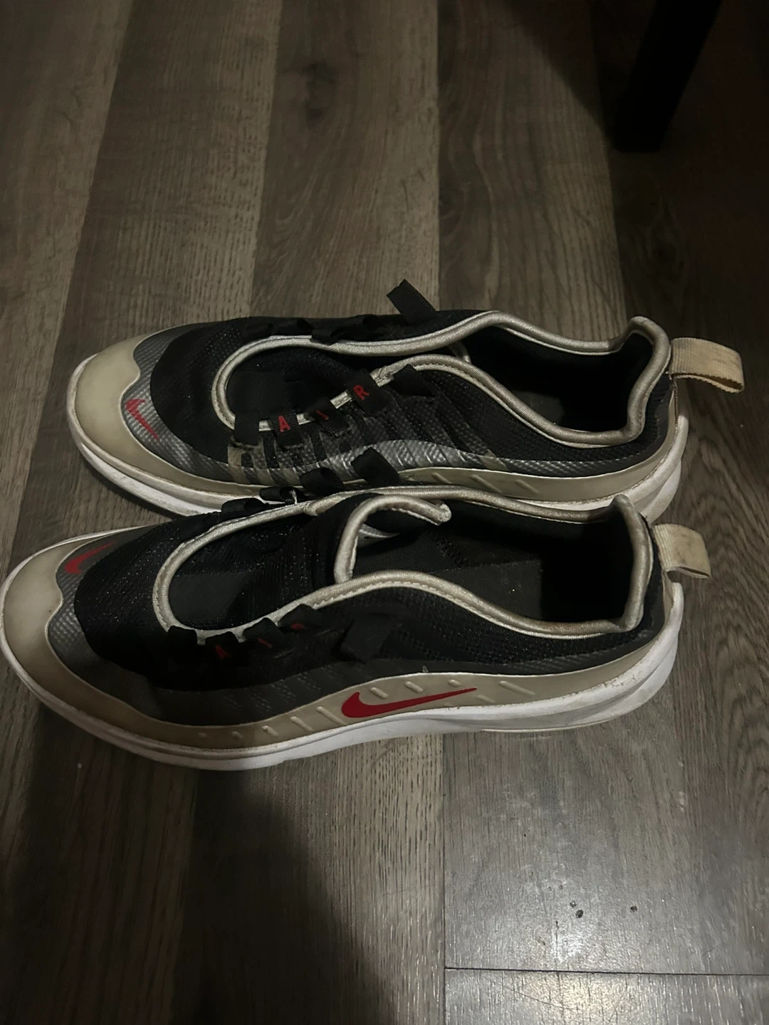 Selling a pair of Nike Air Max Axis sneakers. They have a black and silver color scheme with red accents. They are in used condition, as shown in the pictures.
