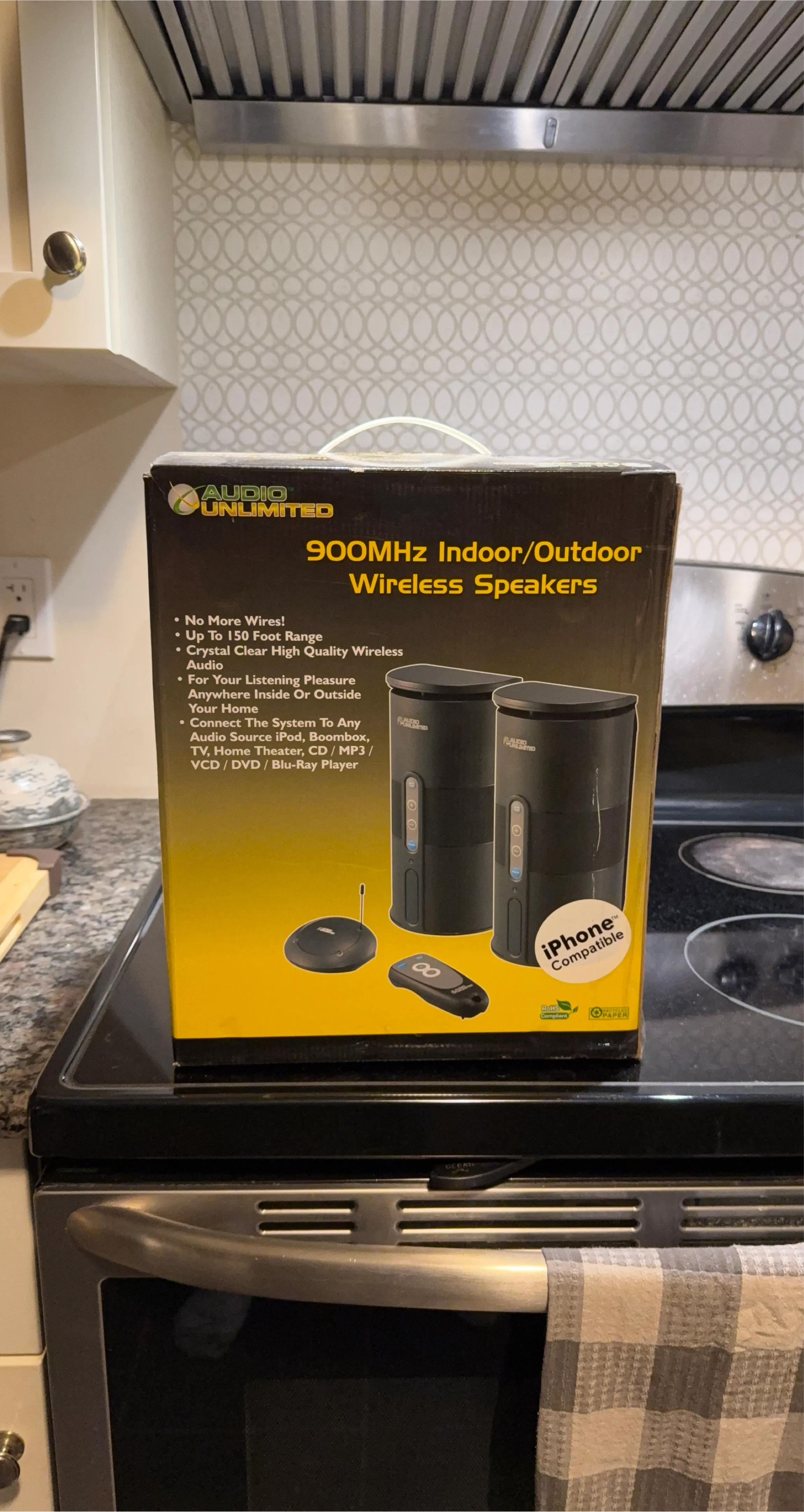 No more wires with these Audio Unlimited 900MHz indoor/outdoor wireless speakers! They offer up to a 150-foot range and crystal clear sound. The system connects to any audio source like iPods, boomboxes, TVs, or Blu-Ray players. iPhone compatible.