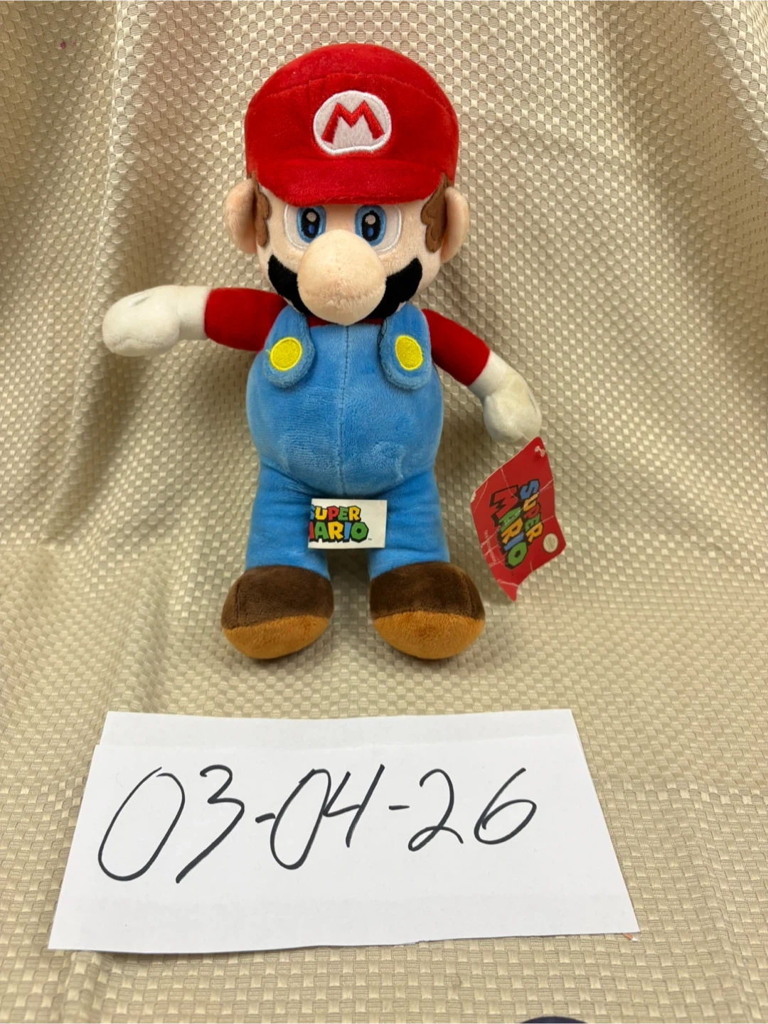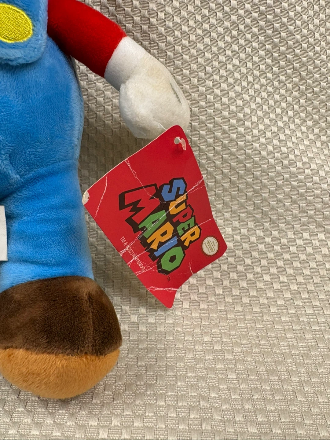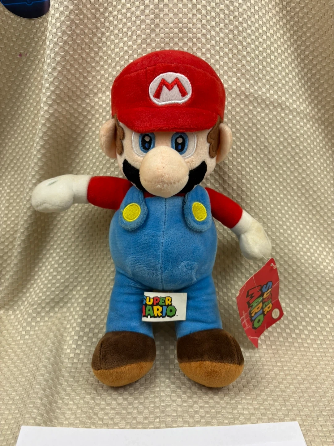 This is a Super Mario plush toy. It's made of soft material and features his classic red hat and blue overalls. Great for any Super Mario fan!