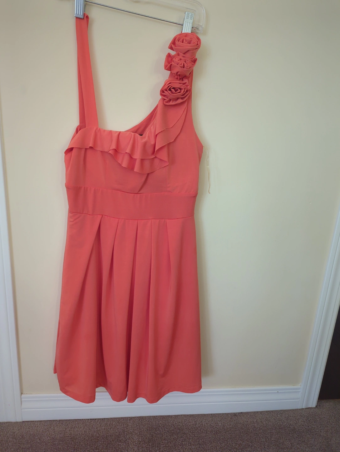 Beautiful coral dress. One-shoulder design. Features a ruffled neckline and three dimensional floral accent. A-line silhouette. Perfect for a special occasion.