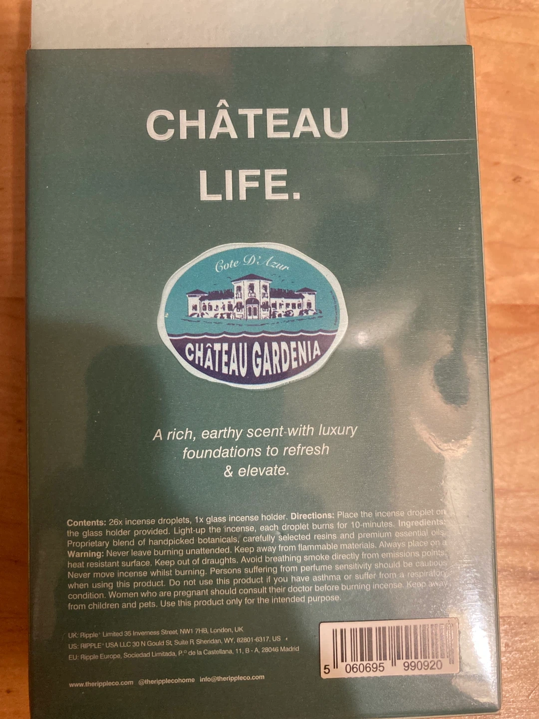 This Ripple+ Home set includes Chateau Gardenia incense droplets with a luxurious earthy floral scent with Freesia and Frankincense. It comes with 26x incense droplets and 1x glass incense holder. The ingredients are proprietary blends of handpicked botanicals, selected resins, and premium essential oils.