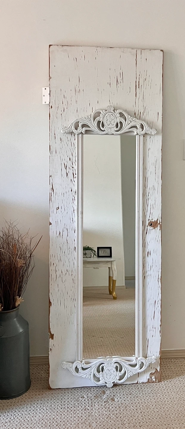 Rustic farmhouse door mirror with distressed white finish and beautiful ornate detail.