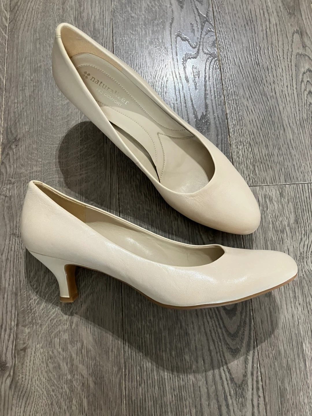 These Naturalizer pumps are a cream colour and made of leather. They feature a kitten heel and a comfortable fit. These shoes are great for everyday wear!