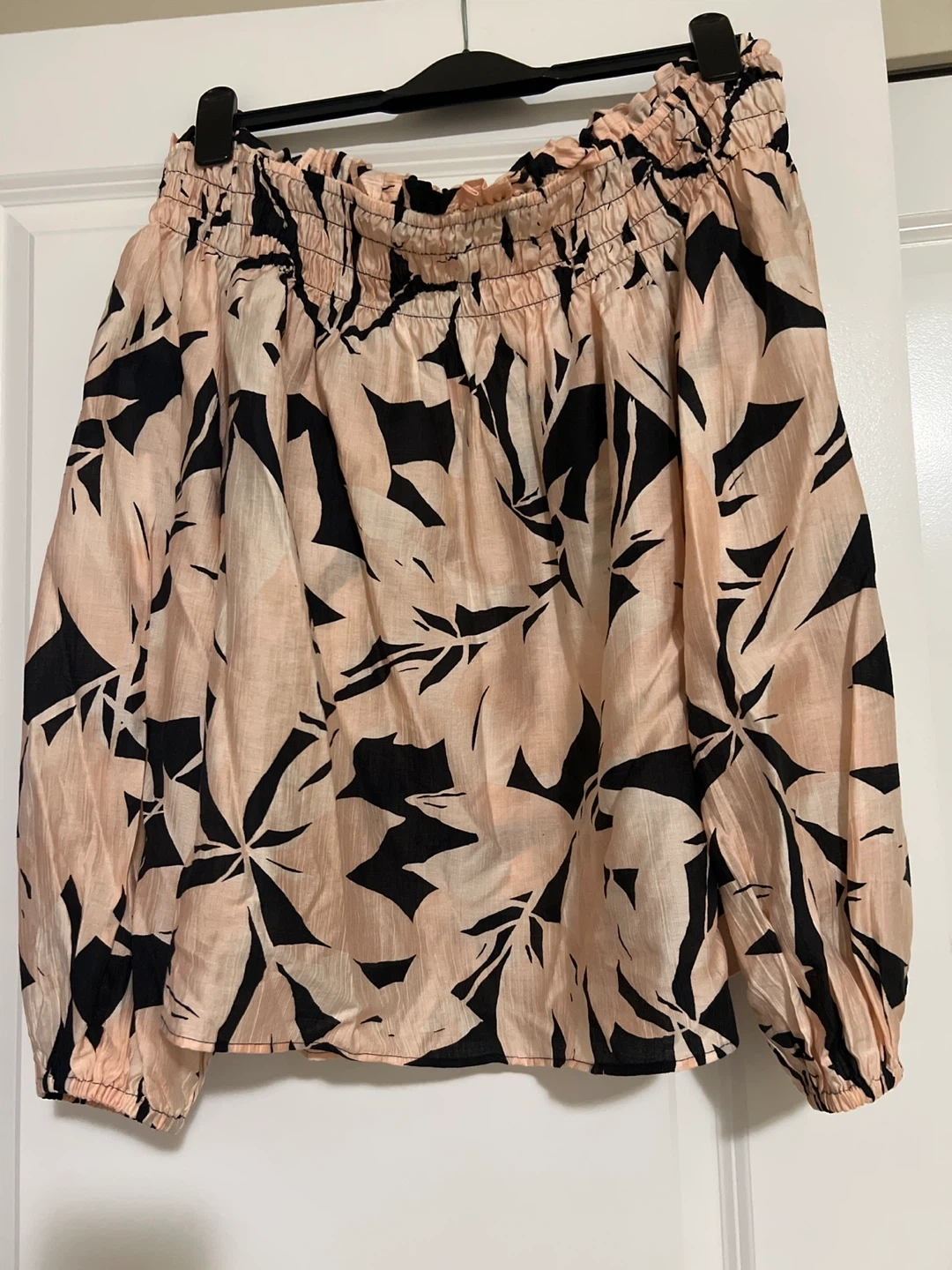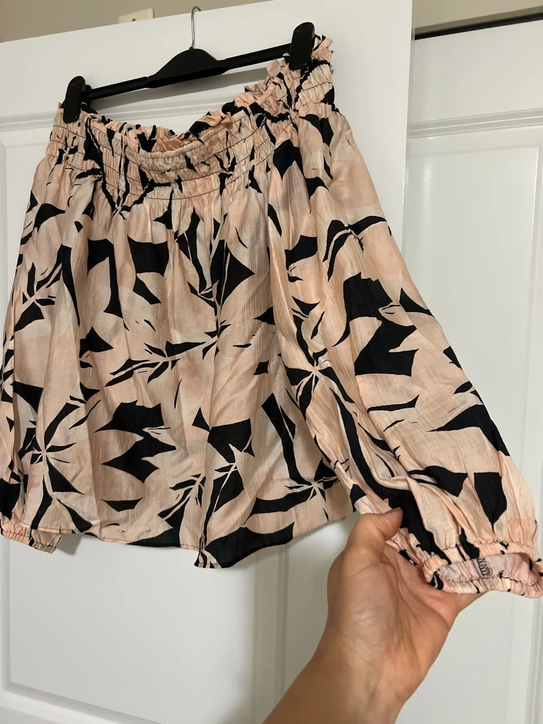 This H&M off-the-shoulder blouse comes in a pretty pink and black floral print. It's a size L with a shirred neckline and cuffs. This top's flowy design makes it a great piece for warmer weather!