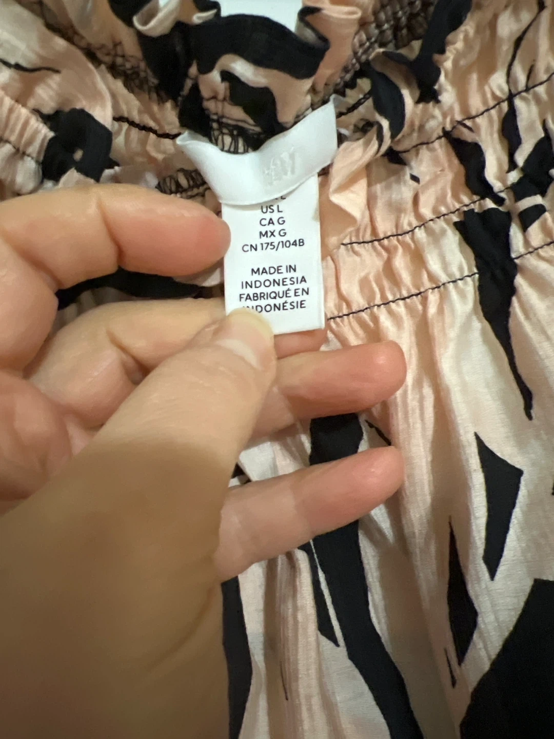 This H&M off-the-shoulder blouse comes in a pretty pink and black floral print. It's a size L with a shirred neckline and cuffs. This top's flowy design makes it a great piece for warmer weather!