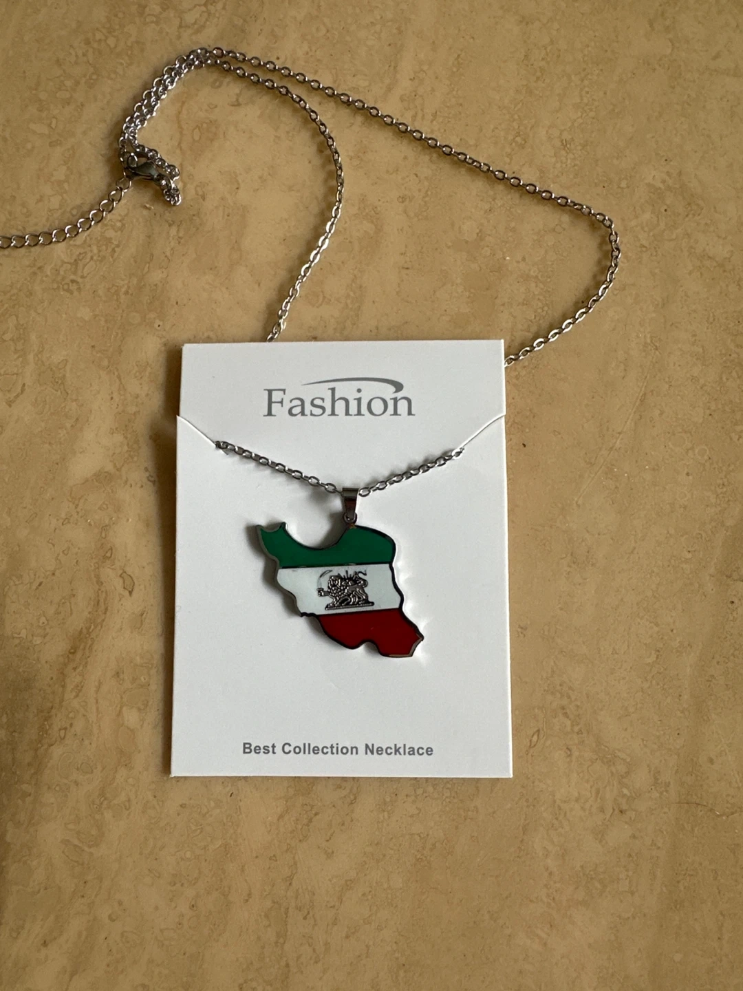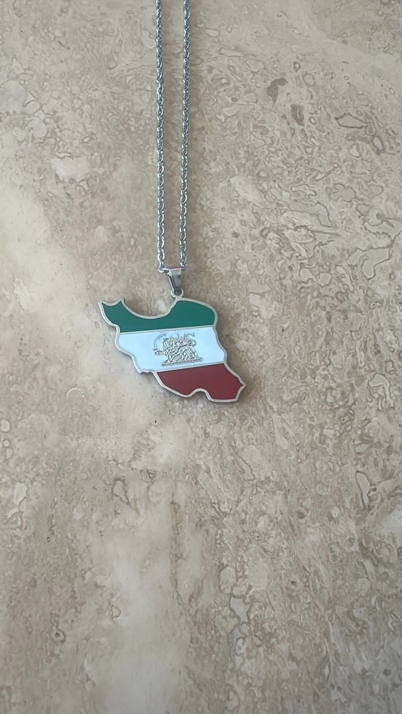 This stainless steel necklace features a pendant shaped like the map of Iran, coloured with the national flag. It's on a silver-coloured chain.