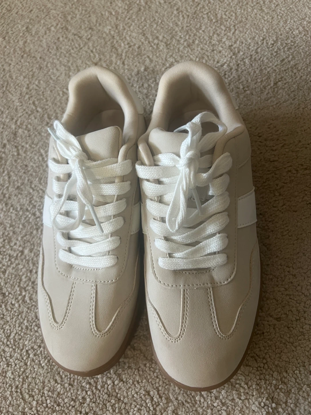These are American Eagle sneakers in a light beige colour. They're made with a polyurethane upper and a rubber outsole. This style is 230 CN (1.5). Great for everyday casual wear!