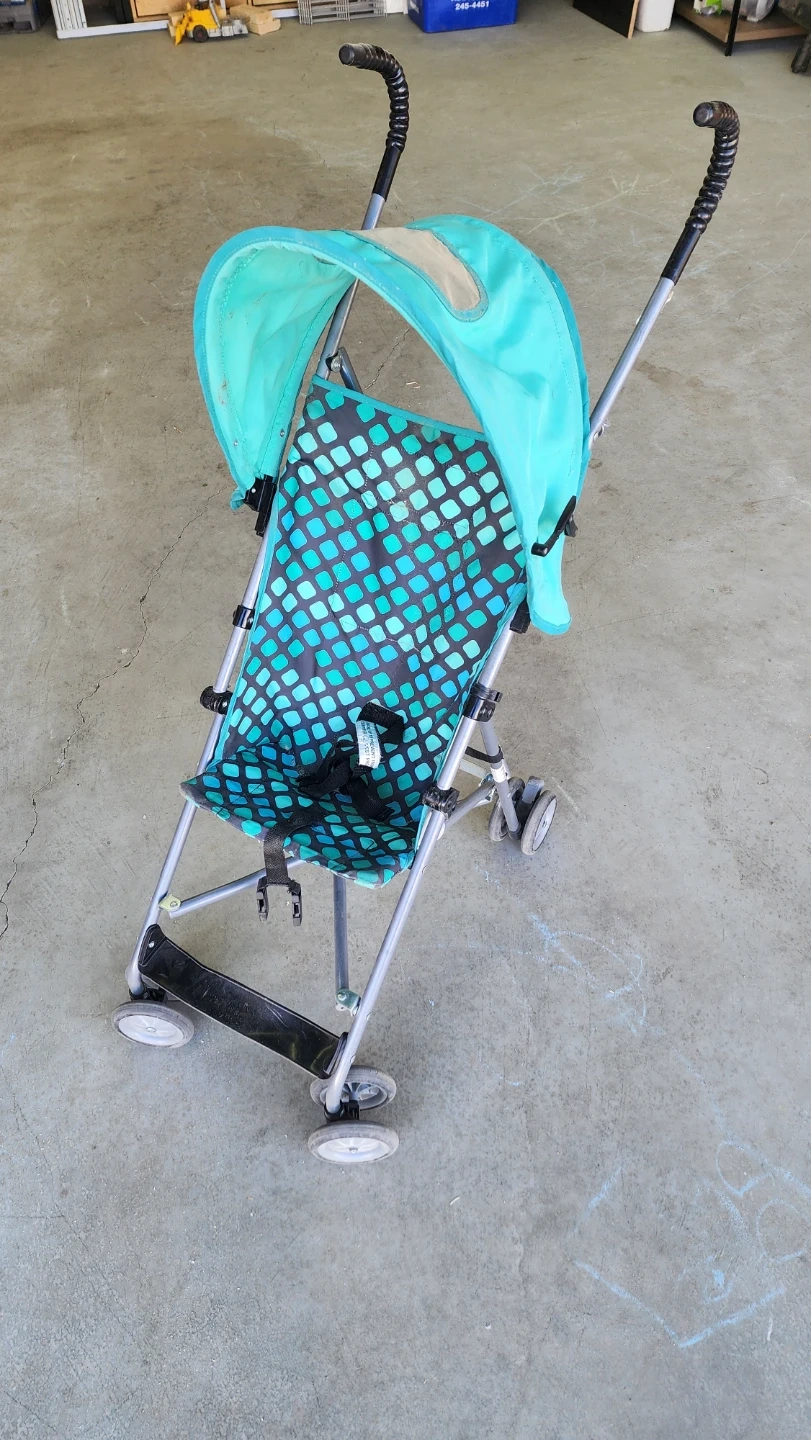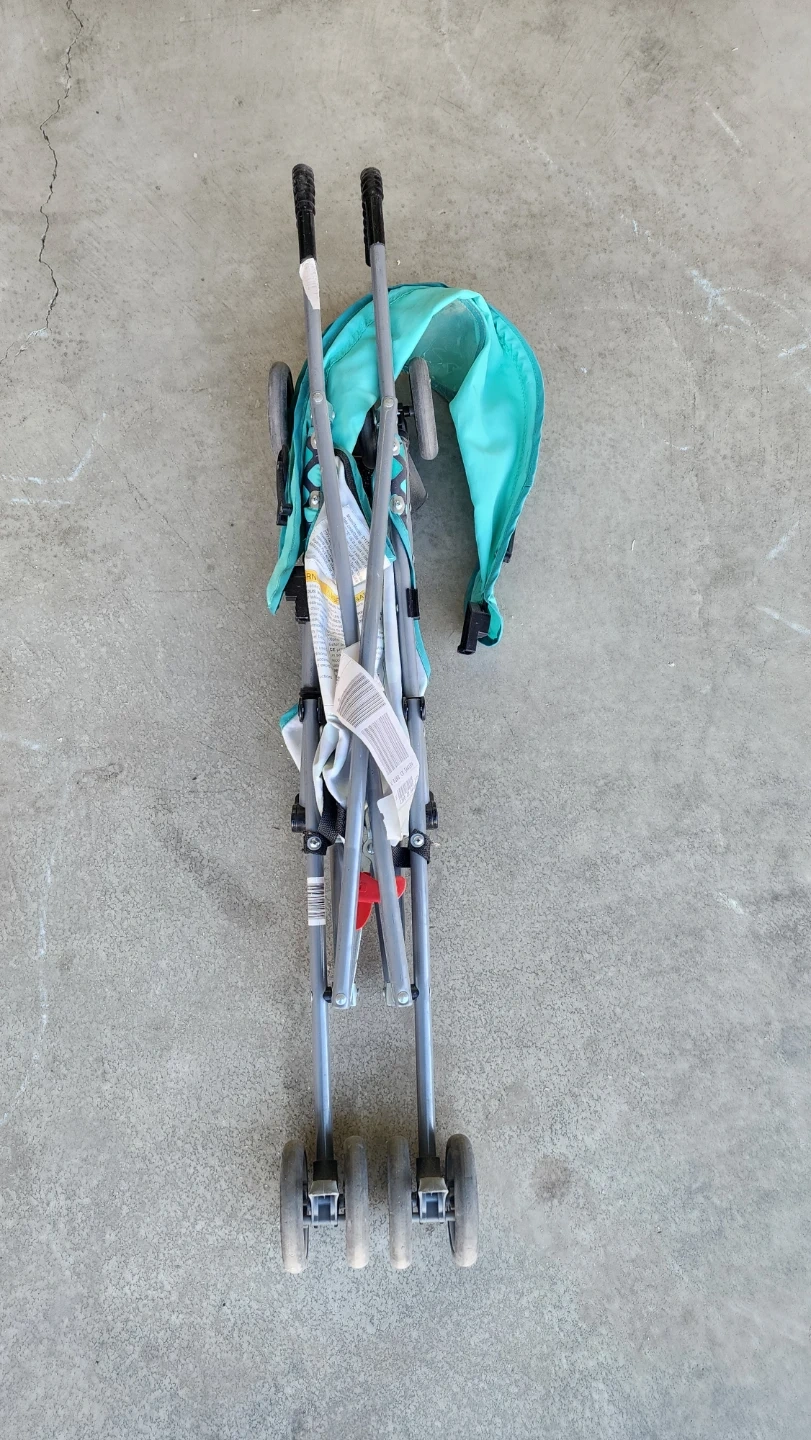 This is a lightweight umbrella stroller with a teal canopy and a black and teal patterned seat. It folds compactly for easy storage and transport. It's suitable for quick trips out and about.