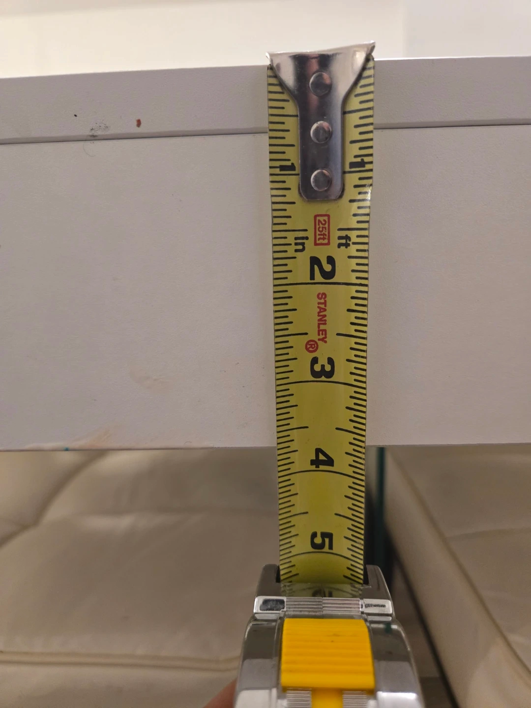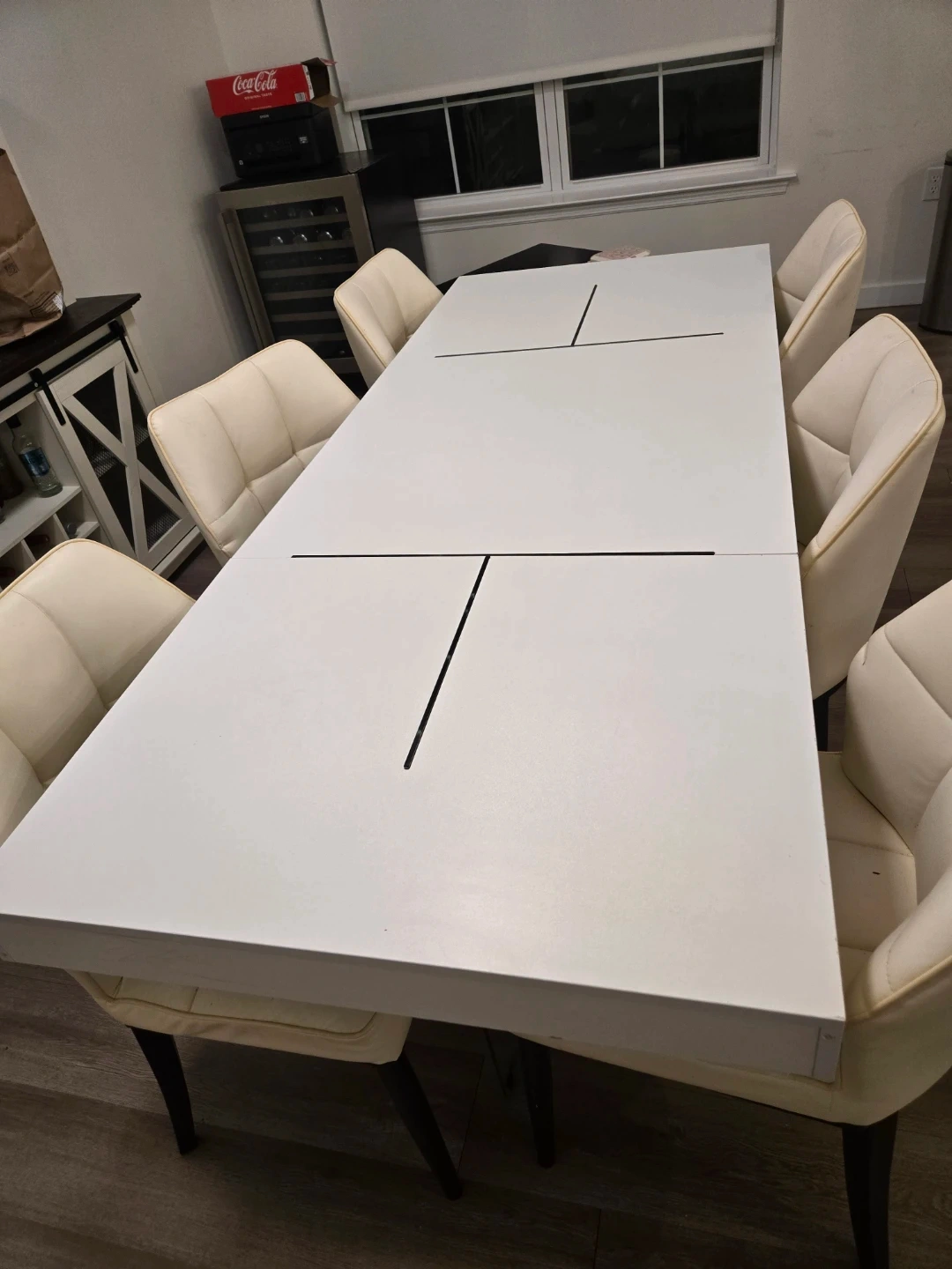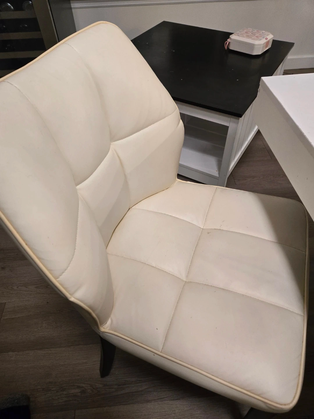 These dining chairs feature cream-colored upholstery with a tufted design. The legs are dark wood. There's a small pink mark on one chair's back. These chairs offer comfortable seating for your dining room. Measurements of table are 29.5"H x 31.5"W x 78 3/4" L.